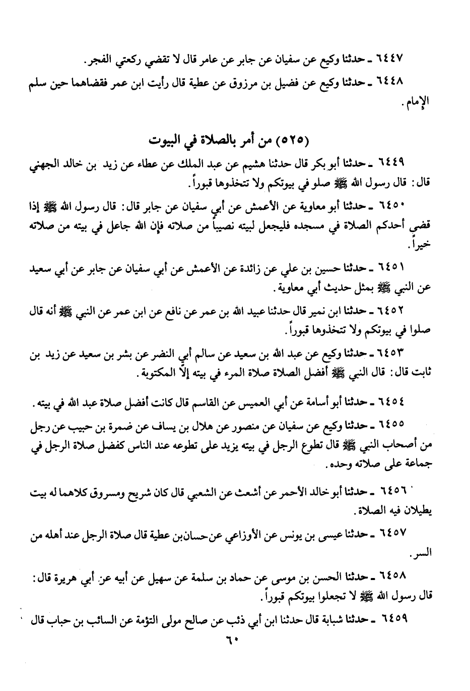 6452 - حَدَّثَنَا ابْنُ نُمَيْرٍ، قَالَ: حَدَّثَنَا عُبَيْدُ اللَّهِ بْنُ عُمَرَ، عَنْ نَافِعٍ، عَنِ ابْنِ عُمَرَ، عَنِ النَّبِيِّ صَلَّى اللهُ عَلَيْهِ وَسَلَّمَ أَنَّهُ قَالَ: «§صَلُّوا فِي بُيُوتِكُمْ وَلَا تَتَّخِذُوهَا قُبُورًا»