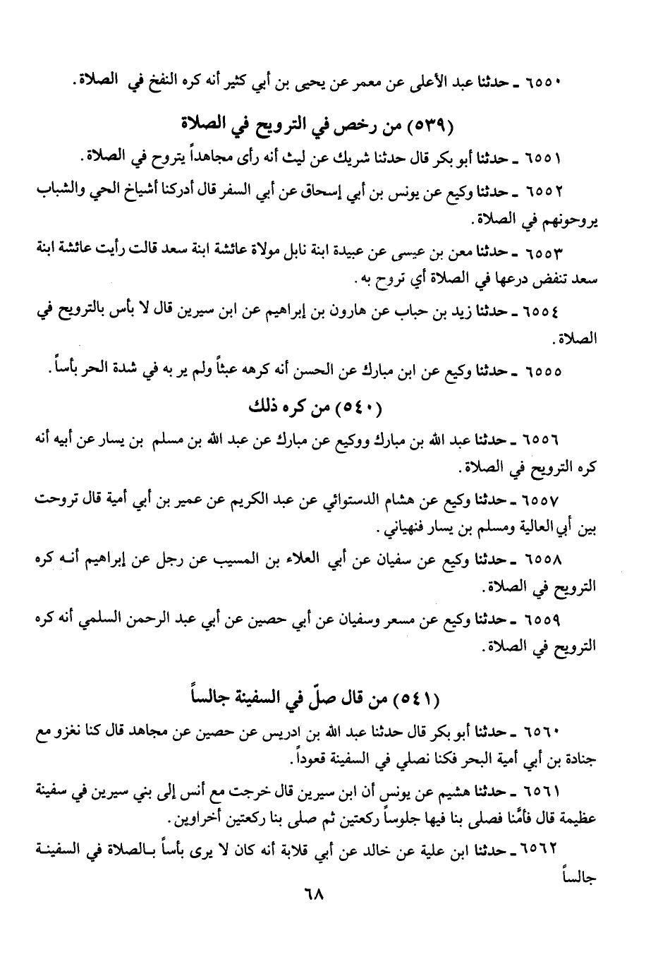 6559 - حَدَّثَنَا وَكِيعٌ، عَنْ مِسْعَرٍ، وَسُفْيَانَ، عَنْ أَبِي حَصِينٍ، عَنْ أَبِي عَبْدِ الرَّحْمَنِ السُّلَمِيِّ، «أَنَّهُ §كَرِهَ التَّرْوِيحَ فِي الصَّلَاةِ»