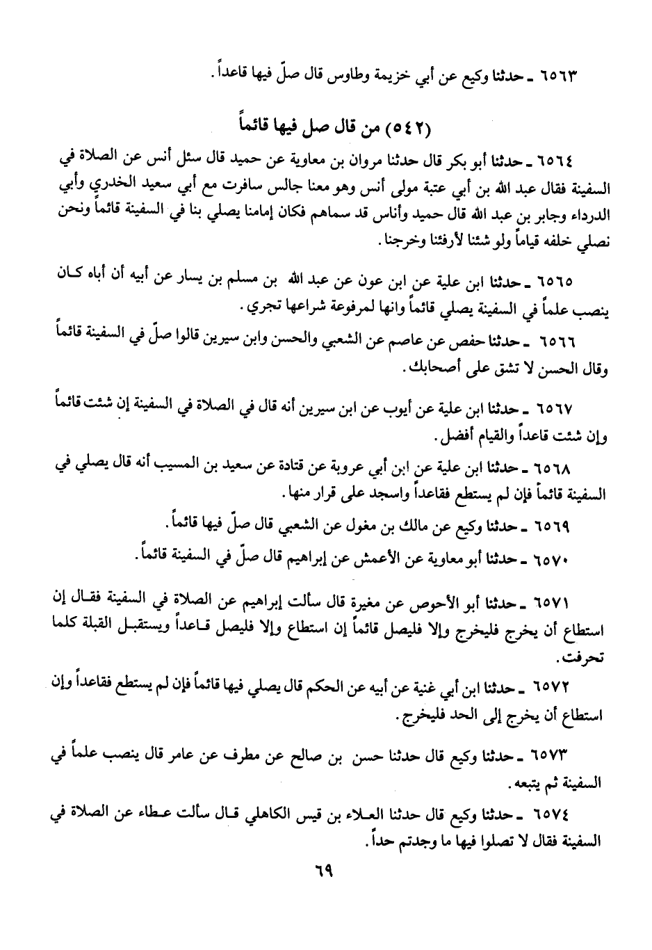 6574 - حَدَّثَنَا وَكِيعٌ، قَالَ: حَدَّثَنَا الْعَلَاءُ بْنُ قَيْسٍ الْكَاهِلِيُّ، قَالَ: سَأَلْتُ عَطَاءً عَنِ الصَّلَاةِ فِي السَّفِينَةِ، فَقَالَ: «§لَا تُصَلُّوا فِيهَا مَا وَجَدْتُمْ حَدًّا»