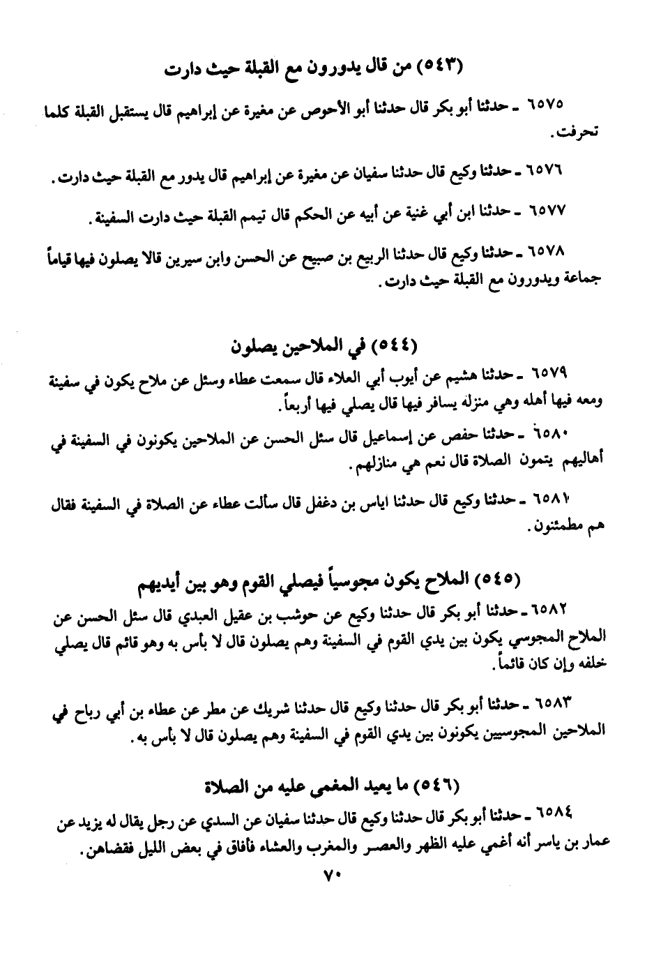 6576 - حَدَّثَنَا وَكِيعٌ، قَالَ: حَدَّثَنَا سُفْيَانُ، عَنْ مُغِيرَةَ، عَنْ إِبْرَاهِيمَ، قَالَ: «§يَدُورُ مَعَ الْقِبْلَةِ حَيْثُ دَارَتْ»