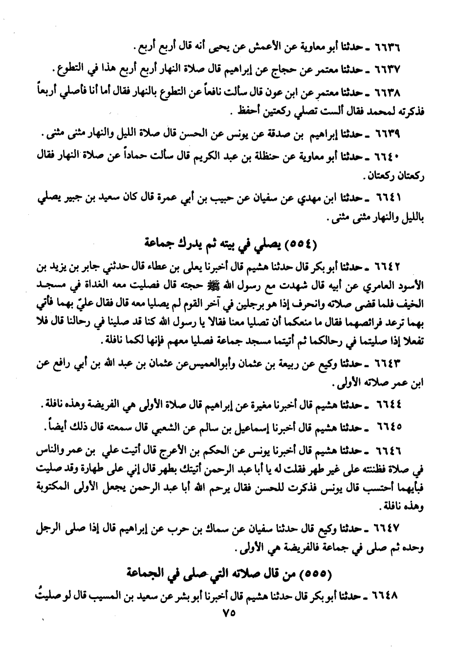 6639 - حَدَّثَنَا إِبْرَاهِيمُ بْنُ صَدَقَةَ، عَنْ يُونُسَ، عَنِ الْحَسَنِ، قَالَ: «§صَلَاةُ اللَّيْلِ وَالنَّهَارِ مَثْنَى مَثْنَى»