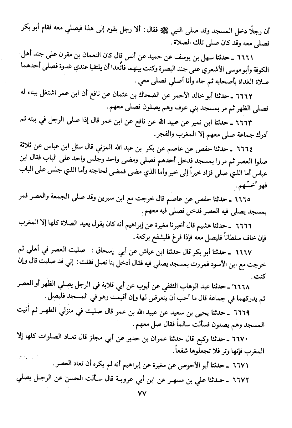 6672 - حَدَّثَنَا عَلِيُّ بْنُ مُسْهِرٍ، عَنِ ابْنِ أَبِي عَرُوبَةَ، قَالَ: سَأَلْتُ الْحَسَنَ عَنِ الرَّجُلِ يُصَلِّي الْمَكْتُوبَةَ، ثُمَّ يَأْتِي الْمَسْجِدَ وَالْقَوْمُ يُصَلُّونَ تِلْكَ الصَّلَاةَ، قَالَ: «§يُصَلِّي مَعَهُمْ مَا خَلَا هَاتَيْنِ الصَّلَاتَيْنِ الْفَجْرِ وَالْعَصْرِ»