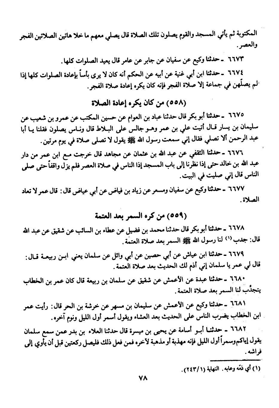 6680 - حَدَّثَنَا عَبْدَةُ، عَنِ الْأَعْمَشِ، عَنْ شَقِيقٍ، عَنْ سَلْمَانَ بْنِ رَبِيعَةَ، قَالَ: «كَانَ عُمَرُ بْنُ الْخَطَّابِ §يَتَجَدَّبُ لَنَا السَّمَرَ بَعْدَ صَلَاةِ الْعَتَمَةِ»
