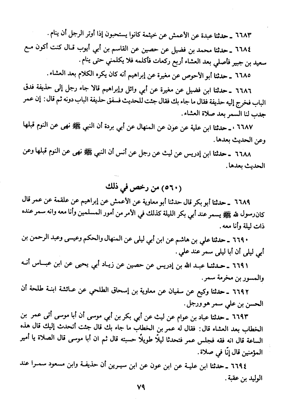 6685 - حَدَّثَنَا أَبُو الْأَحْوَصِ، عَنْ مُغِيرَةَ، عَنْ إِبْرَاهِيمَ، «أَنَّهُ كَانَ §يَكْرَهُ الْكَلَامَ بَعْدَ الْعِشَاءِ»
