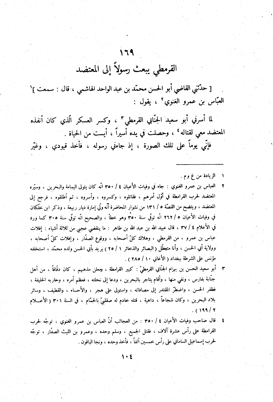 حَدثنِي القَاضِي أَبُو الْحسن مُحَمَّد بن عبد الْوَاحِد الْهَاشِمِي، قَالَ: سَمِعت الْعَبَّاس بن عَمْرو الغنوي، يَقُول: لما أسرني أَبُو سعيد الجنابي القرمطي، وَكسر الْعَسْكَر الَّذِي كَانَ أنفذه المعتضد معي لقتاله، وحصلت فِي يَده أَسِيرًا، أَيِست من الْحَيَاة.