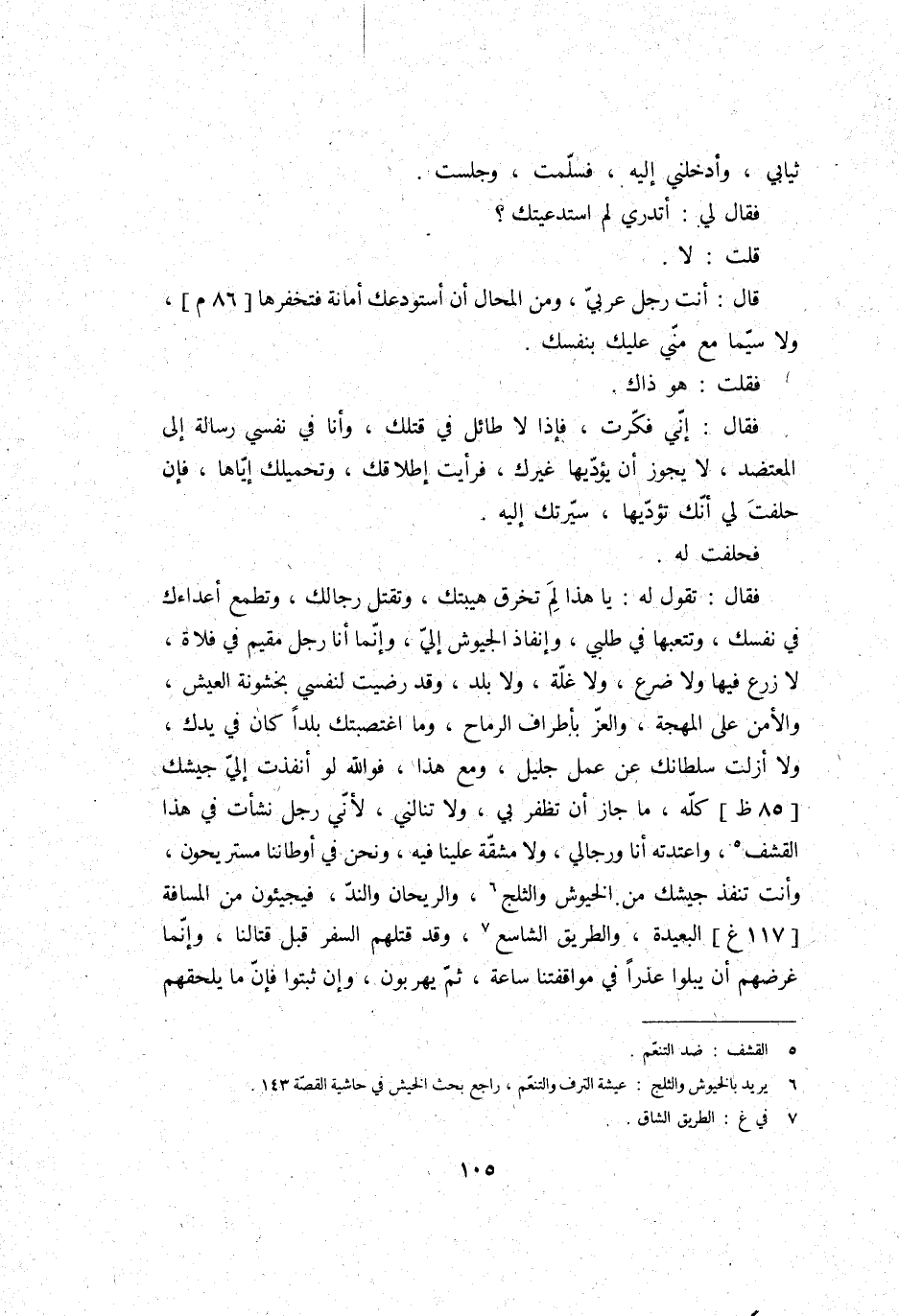فَقَالَ: تَقول لَهُ: يَا هَذَا لم تخرق هيبتك، وَتقتل رجالك، وتطمع أعداءك فِي نَفسك، وتتبعها فِي طلبي، وإنفاذ الجيوش إِلَيّ، وَإِنَّمَا أَنا رجل مُقيم فِي فلاة، لَا زرع فِيهَا وَلَا ضرع، وَلَا غلَّة وَلَا بلد، وَقد رضيت لنَفْسي بخشونة الْعَيْش، والأمن على المهجة، والعز بأطراف الرماح، وَمَا اغتصبتك بَلَدا كَانَ فِي يدك، وَلَا أزلت سلطانك عَن عمل جليل، وَمَعَ هَذَا، فوَاللَّه لَو أنفذت إِلَيّ جيشك كُله، مَا جَازَ أَن تظفر بِي، وَلَا تنالني؛ لِأَنِّي رجل نشأت فِي هَذَا القشف، واعتدته أَنا ورجالي، وَلَا مشقة علينا فِيهِ، وَنحن فِي أوطاننا مستريحون، وَأَنت تنفذ جيشك من الجيوش والثلج، وَالريحَان والند، فيجيئون من الْمسَافَة الْبَعِيدَة، وَالطَّرِيق الشاسع، وَقد قَتلهمْ السّفر قبل قتالنا، وَإِنَّمَا غرضهم أَن يبلوا عذرا فِي موافقتنا سَاعَة، ثمَّ يهربون، وَإِن ثبتوا فَإِن مَا يلحقهم