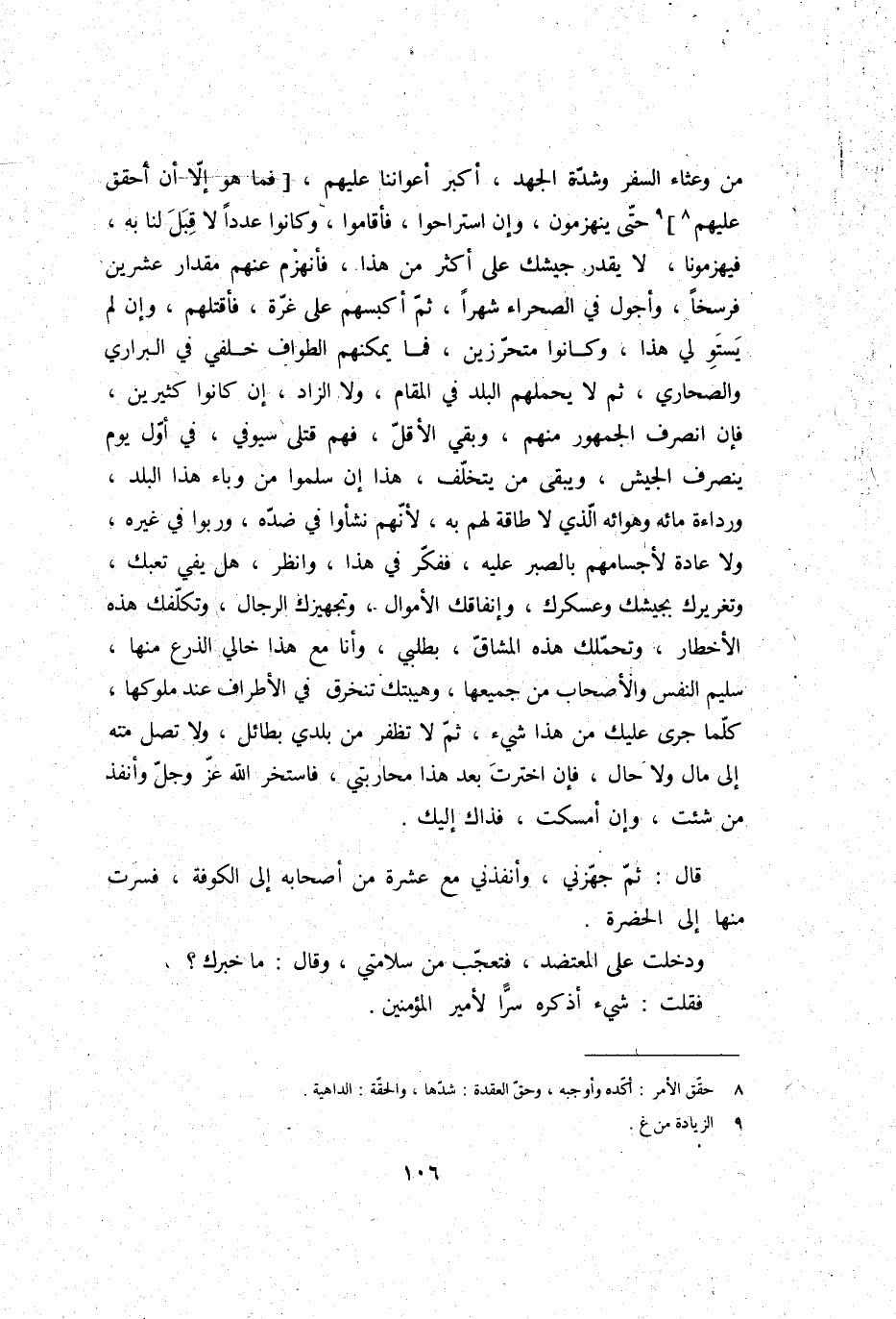 من وعثاء السّفر وَشدَّة الْجهد أكبر أعواننا عَلَيْهِم، فَمَا هُوَ إِلَّا أَن أحقق عَلَيْهِم حَتَّى ينهزمون، وَإِن استراحوا، فأقاموا، وَكَانُوا عددا لَا قبل لنا بِهِ، فيهزمونا، لَا يقدر جيشك على أَكثر من هَذَا، فأنهزم عَنْهُم مِقْدَار عشْرين فرسخا، وأجول فِي الصَّحرَاء شهرا، ثمَّ أكبسهم على غرَّة، فأقتلهم، وَإِن لم يستو لي هَذَا، وَكَانُوا متحرزين، فَمَا يُمكنهُم الطّواف خَلْفي فِي البراري والصحاري، ثمَّ لَا يحملهم الْبَلَد فِي الْمقَام، وَلَا الزَّاد، إِن كَانُوا كثيرين، فَإِن انْصَرف الْجُمْهُور مِنْهُم، وَبَقِي الْأَقَل، فهم قَتْلَى سيوفي، فِي أول يَوْم ينْصَرف الْجَيْش، وَيبقى من يتَخَلَّف، هَذَا إِن سلمُوا من وباء هَذَا الْبَلَد، ورداءة مَائه وهوائه الَّذِي لَا طَاقَة لَهُم بِهِ، لأَنهم نشئوا فِي ضِدّه، وربوا فِي غَيره، وَلَا عَادَة لأجسامهم بِالصبرِ عَلَيْهِ، ففكر فِي هَذَا، وَانْظُر، هَل يَفِي تعبك، وتغريرك بجيشك وعسكرك، وإنفاقك الْأَمْوَال، وتجهيزك الرِّجَال، وتكلفك هَذِه الأخطار، وتحملك هَذِه المشاق، بطلبي، وَأَنا مَعَ هَذَا خَالِي الذرع مِنْهَا، سليم النَّفس وَالْأَصْحَاب من جَمِيعهَا، وهيبتك تنخرق فِي الْأَطْرَاف عِنْد مُلُوكهَا، كلما جرى عَلَيْك من هَذَا شَيْء، ثمَّ لَا تظفر من بلدي بطائل، وَلَا تصل مِنْهُ إِلَى مَال وَلَا حَال، فَإِن اخْتَرْت بعد هَذَا محاربتي، فاستخر الله عز وَجل وأنفذ من شِئْت، وَإِن أَمْسَكت فَذَاك إِلَيْك.