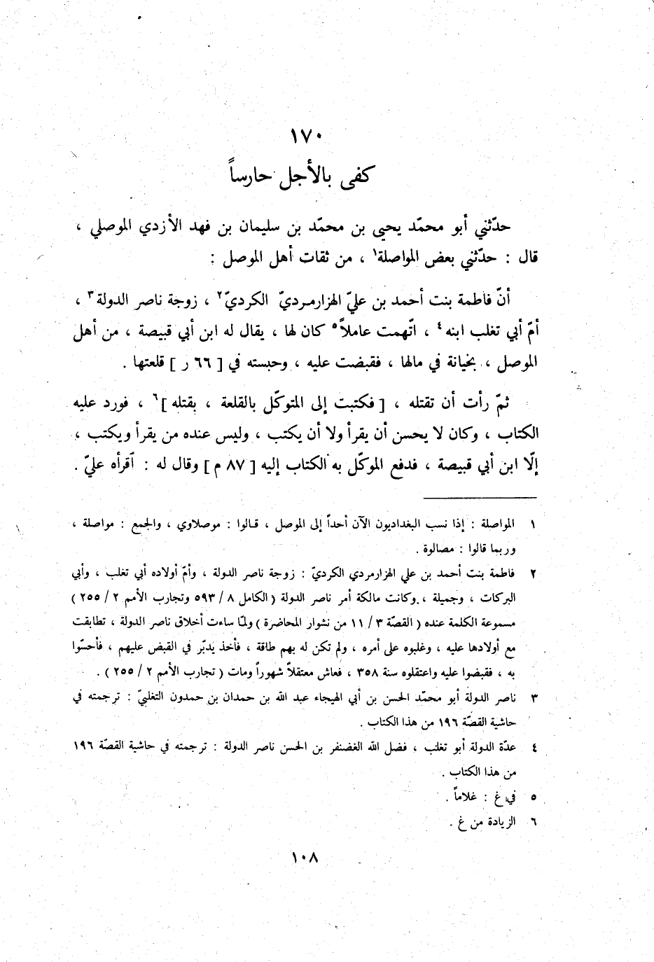 حَدثنِي أَبُو مُحَمَّد يحيى بن مُحَمَّد بن سُلَيْمَان بن فَهد الْأَزْدِيّ الْموصِلِي، قَالَ: حَدثنِي بعض المواصلة، من ثِقَات أهل الْموصل: أَن فَاطِمَة بنت أَحْمد بن عَليّ الهزارمردي الْكرْدِي، زَوْجَة نَاصِر الدولة، أم أبي تغلب ابْنه، اتهمت عَاملا كَانَ لَهَا، يُقَال لَهُ: ابْن أبي قبيصَة، من أهل الْموصل، بخيانة فِي مَالهَا، فقبضت عَلَيْهِ، وحبسته فِي قلعتها.