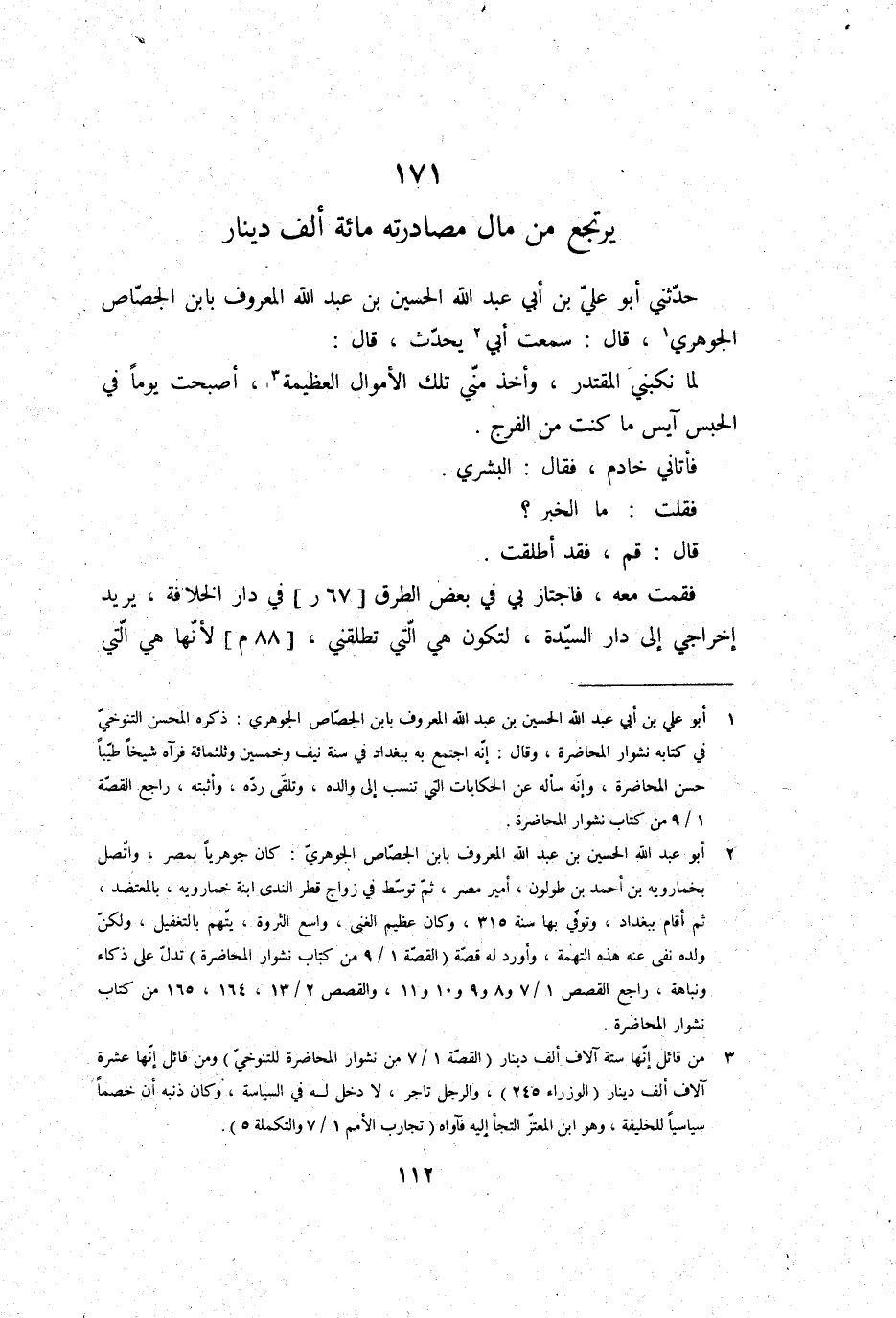 حَدثنِي أَبُو عَليّ بن أبي عبد الله الْحُسَيْن بن عبد الله الْمَعْرُوف بِابْن الْجَصَّاص الْجَوْهَرِي، قَالَ: سَمِعت أبي يحدث، قَالَ: لما نكبني المقتدر، وَأخذ مني تِلْكَ الْأَمْوَال الْعَظِيمَة، أَصبَحت يَوْمًا فِي الْحَبْس آيس مَا كنت من الْفرج.