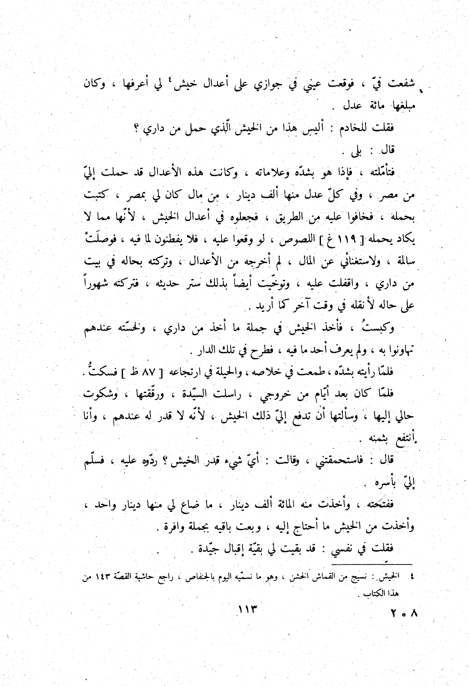 فتأملته، فَإِذا هُوَ بشده وعلاماته، وَكَانَت هَذِه الأعدال قد حملت إِلَيّ من مصر، وَفِي كل عدل مِنْهَا ألف دِينَار، من مَال كَانَ لي بِمصْر، كتبت بِحمْلِهِ، فخافوا عَلَيْهِ من الطَّرِيق، فجعلوه فِي أعدال الخيش؛ لِأَنَّهَا مِمَّا لَا يكَاد يحملهُ اللُّصُوص، لَو وَقَعُوا عَلَيْهِ، فَلَا يَفْطنُون لما فِيهِ، فوصلت سَالِمَة، ولاستغنائي عَن المَال، لم أخرجه من الأعدال، وَتركته بِحَالهِ فِي بَيت من دَاري، وأقفلت عَلَيْهِ، وتوخيت أَيْضا بذلك ستر حَدِيثه، فتركته شهورا على حَاله لأنقله فِي وَقت آخر كَمَا أُرِيد.