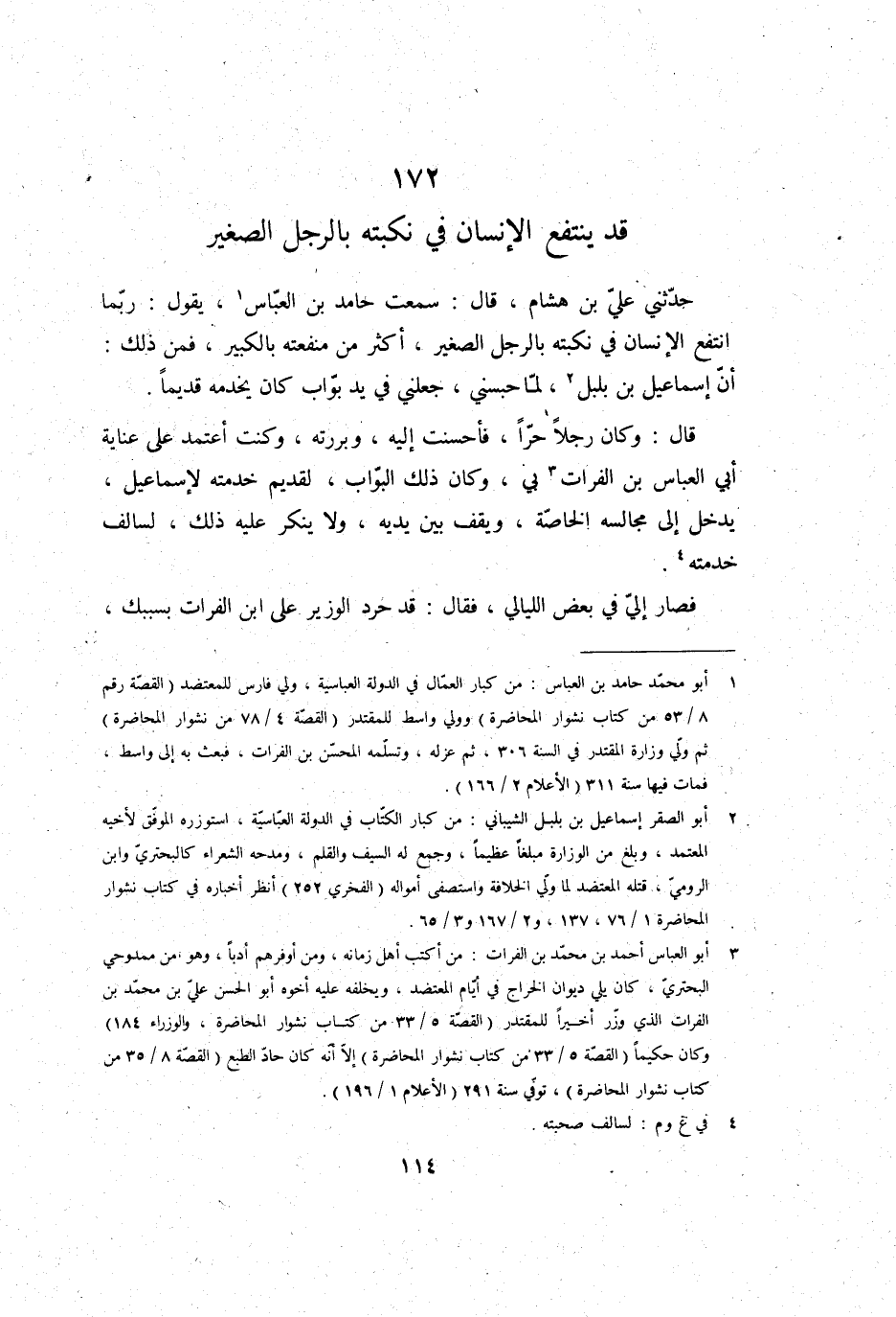 حَدثنِي عَليّ بن هِشَام، قَالَ: سَمِعت حَامِد بن الْعَبَّاس، يَقُول: رُبمَا انْتفع الْإِنْسَان فِي نكبته بِالرجلِ الصَّغِير، أَكثر من منفعَته بالكبير، فَمن ذَلِك: أَن إِسْمَاعِيل بن بلبل، لما حَبَسَنِي، جعلني فِي يَد بواب كَانَ يَخْدمه قَدِيما.