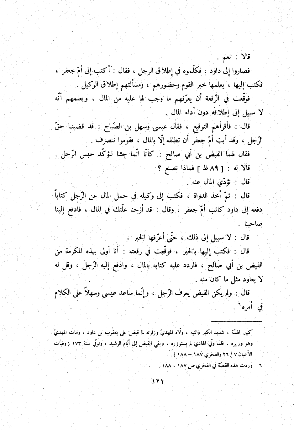 قَالَ: فأقرأهم التوقيع، فَقَالَ عِيسَى وَسَهل بن الصَّباح: قد قضينا حق الرجل، وَقد أَبَت أم جَعْفَر أَن تطلقه إِلَّا بِالْمَالِ، فَقومُوا ننصرف.