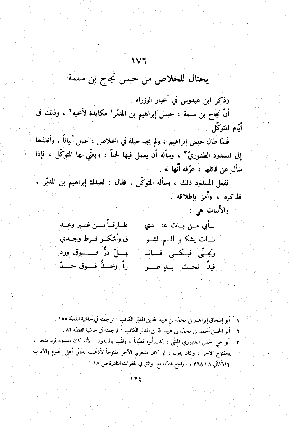 فَلَمَّا طَال حبس إِبْرَاهِيم، وَلم يجد حِيلَة فِي الْخَلَاص، عمل أبياتا، وأنفذها إِلَى المسدود الطنبوري، وَسَأَلَهُ أَن يعْمل فِيهَا لحنا، ويغني بهَا المتَوَكل، فَإِذا سَأَلَ عَن قَائِلهَا، عرفه أَنَّهَا لَهُ.