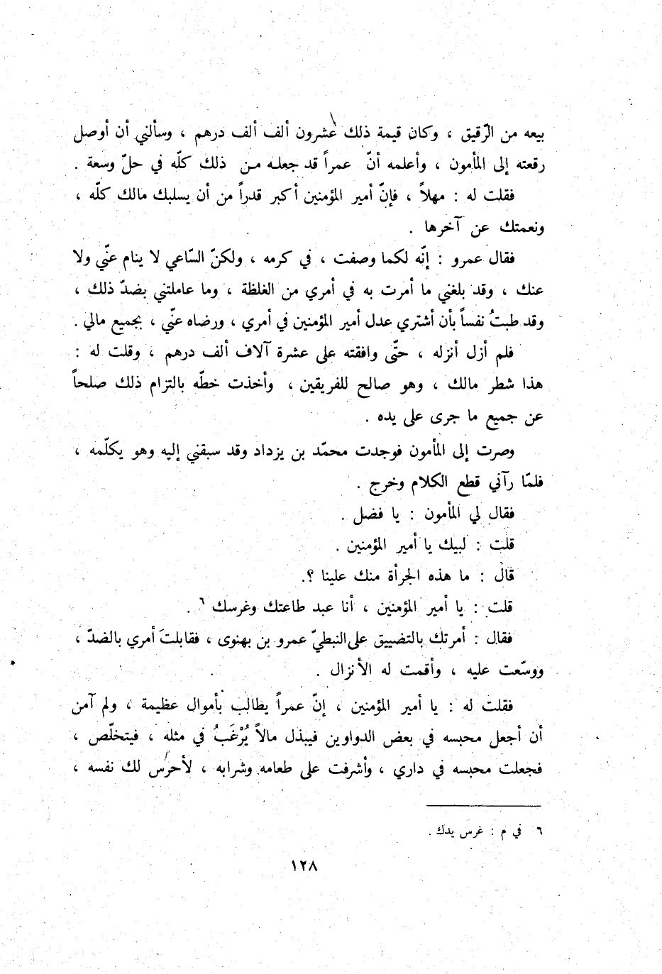 بَيْعه من الرَّقِيق، وَكَانَ قيمَة ذَلِك عشرُون ألف ألف دِرْهَم، وسألني أَن أوصل رقعته إِلَى الْمَأْمُون، وأعلمه أَن عمرا قد جعله من ذَلِك كُله فِي حل وسعة.