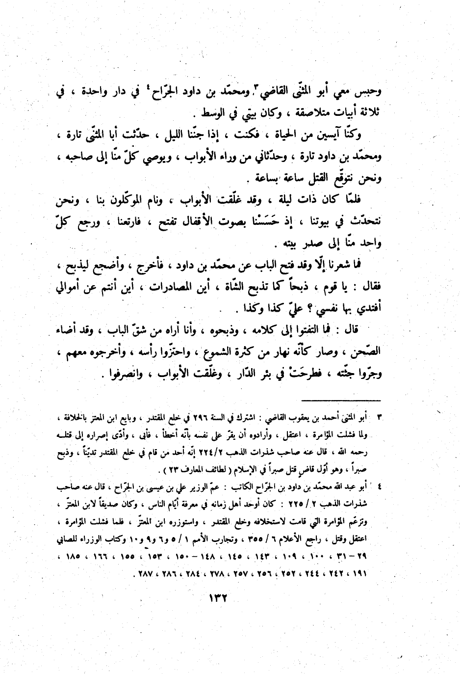 قَالَ: فَمَا التفتوا إِلَى كَلَامه، وذبحوه، وَأَنا أرَاهُ من شقّ الْبَاب، وَقد أَضَاء الصحن، وَصَارَ كَأَنَّهُ نَهَار من كَثْرَة الشموع، واحتزوا رَأسه، وأخرجوه مَعَهم، وجروا جثته، فطرحت فِي بِئْر الدَّار، وغلقت الْأَبْوَاب، وَانْصَرفُوا.