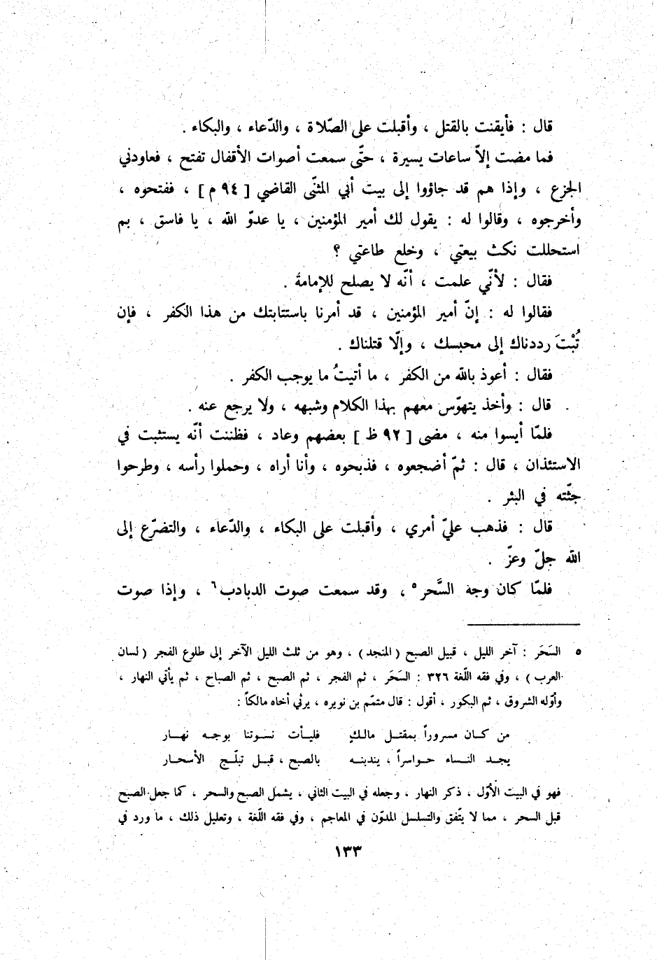 فَقَالُوا لَهُ: إِن أَمِير الْمُؤمنِينَ، قد أمرنَا باستتابتك من هَذَا الْكفْر، فَإِن تبت رددناك إِلَى محبسك، وَإِلَّا قتلناك.