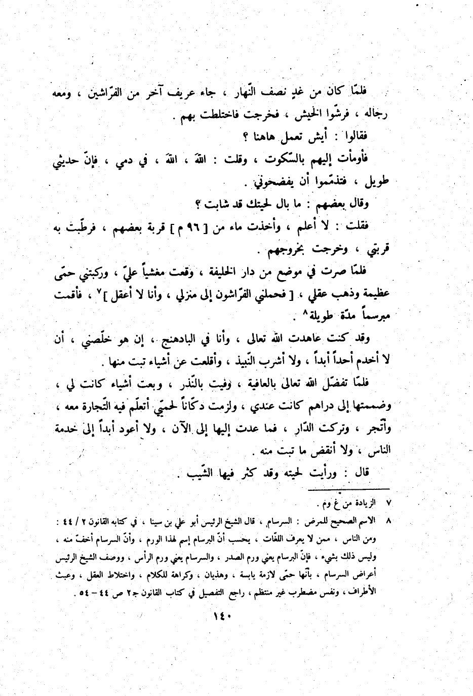 فَلَمَّا تفضل الله تَعَالَى بالعافية، وفيت بِالنذرِ، وبعت أَشْيَاء كَانَت لي، وضممتها إِلَى دَرَاهِم كَانَت عِنْدِي، ولزمت دكانا لحميي أتعلم فِيهِ التِّجَارَة مَعَه، وأتجر، وَتركت الدَّار، فَمَا عدت إِلَيْهَا إِلَى الْآن، وَلَا أَعُود أبدا إِلَى خدمَة النَّاس، وَلَا أنقض مَا تبت مِنْهُ.