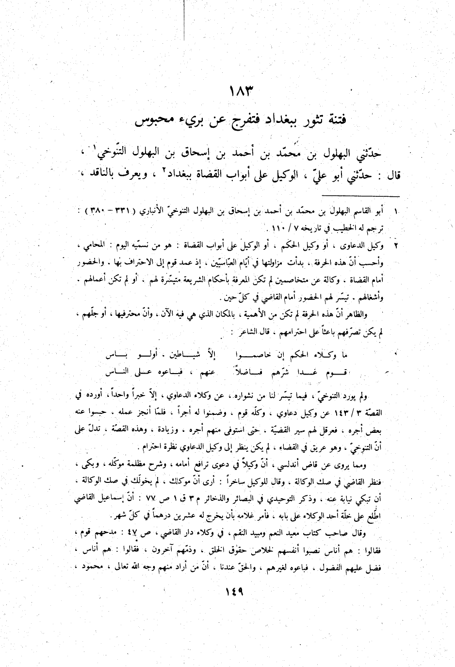 حَدثنِي البهلول بن مُحَمَّد بن أَحْمد بن إِسْحَاق بن البهلول التنوخي، قَالَ: حَدثنِي أَبُو عَليّ، الْوَكِيل على أَبْوَاب الْقُضَاة بِبَغْدَاد، وَيعرف بالناقد،