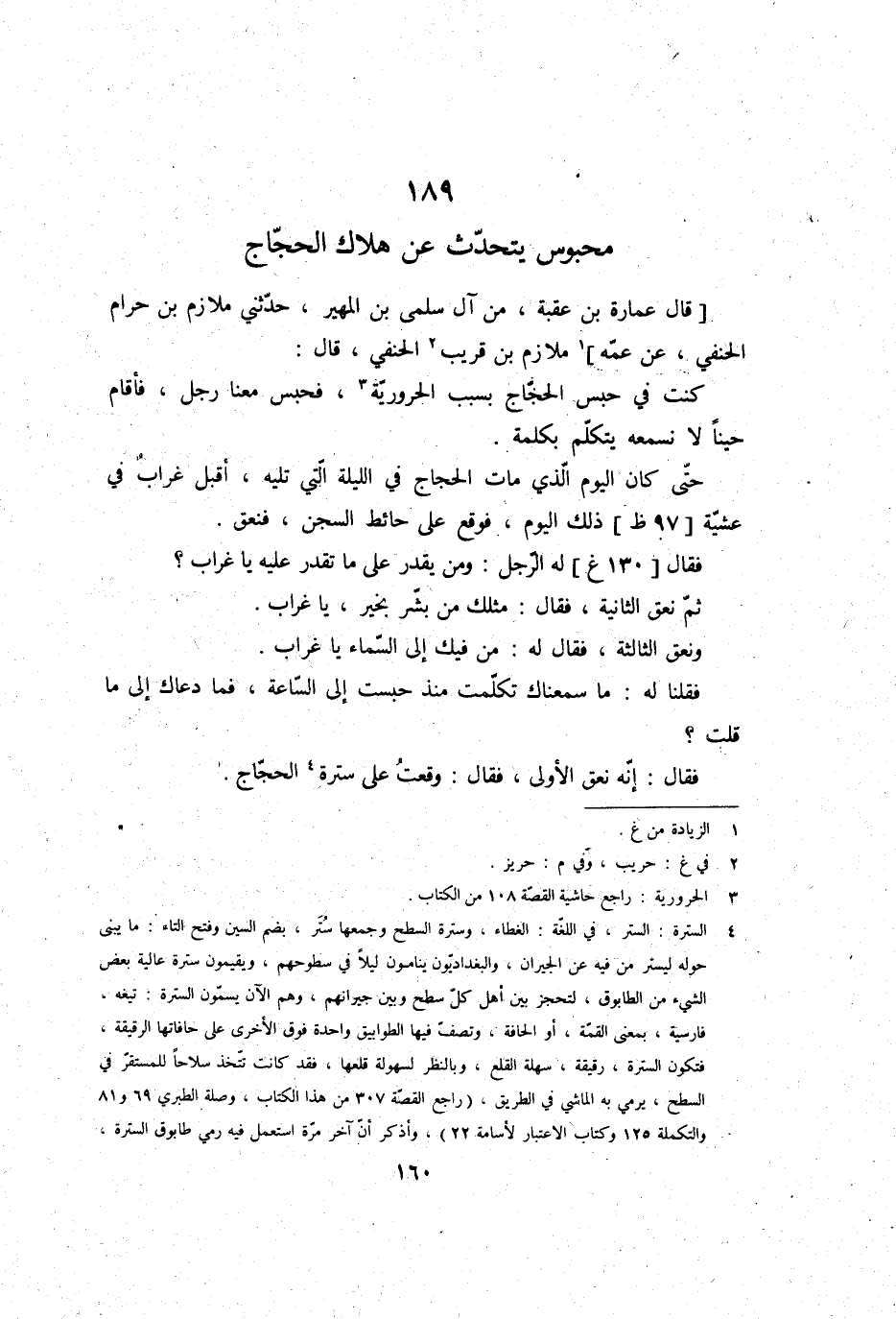 فَقُلْنَا لَهُ: مَا سمعناك تَكَلَّمت مُنْذُ حبست إِلَى السَّاعَة، فَمَا دعَاك إِلَى مَا قلت؟ فَقَالَ: إِنَّه نعق الأولى، فَقَالَ: وَقعت على ستْرَة الْحجَّاج.