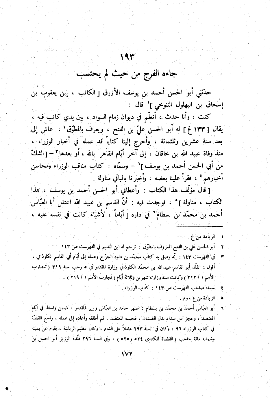 حَدثنِي أَبُو الْحسن أَحْمد بن يُوسُف الْأَزْرَق الْكَاتِب، ابْن يَعْقُوب بن إِسْحَاق بن البهلول التنوخي، قَالَ: كنت، وَأَنا حدث، أتعلم فِي ديوَان زِمَام السوَاد، بَين يَدي كَاتب فِيهِ، يُقَال لَهُ: أَبُو الْحسن عَليّ بن الْفَتْح، وَيعرف بالمطوق، عَاشَ إِلَى بعد سنة عشْرين وَثَلَاث مائَة، وَأخرج إِلَيْنَا كتابا قد عمله فِي أَخْبَار الوزراء، مُنْذُ وَفَاة عبيد الله بن خاقَان، إِلَى آخر أَيَّام القاهر بِاللَّه، أَو بعْدهَا، الشَّك من أبي الْحسن أَحْمد بن يُوسُف، وَسَماهُ: كتاب (مَنَاقِب الوزراء ومحاسن أخبارهم) ، فَقَرَأَ علينا بعضه، وَأخْبرنَا بِالْبَاقِي مناولة.