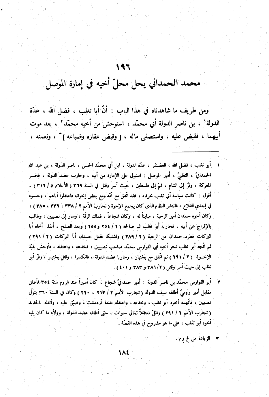 وَمن طريف مَا شَاهَدْنَاهُ فِي هَذَا الْبَاب: أَن أَبَا تغلب، فضل الله، عدَّة الدولة، ابْن نَاصِر الدولة أبي مُحَمَّد، استوحش من أَخِيه مُحَمَّد، بعد موت أَبِيهِمَا، فَقبض عَلَيْهِ، واستصفى مَاله، وَقبض عقاره وضياعه، وَنعمته،