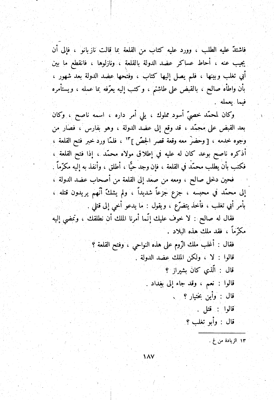 فَاشْتَدَّ عَلَيْهِ الطّلب، وَورد عَلَيْهِ كتاب من القلعة بِمَا قَالَت نازبانو، فَإلَى أَن يُجيب عَنهُ، أحَاط عَسَاكِر عضد الدولة بالقلعة، ونازلوها، فَانْقَطع مَا بَين أبي تغلب وَبَينهَا، فَلم يصل إِلَيْهَا كتاب، وَفتحهَا عضد الدولة بعد شهور، بِأَن واطأه صَالح، بِالْقَبْضِ على طاشتم، وَكتب إِلَيْهِ يعرفهُ بِمَا عمله، ويستأمره فِيمَا يعمله.