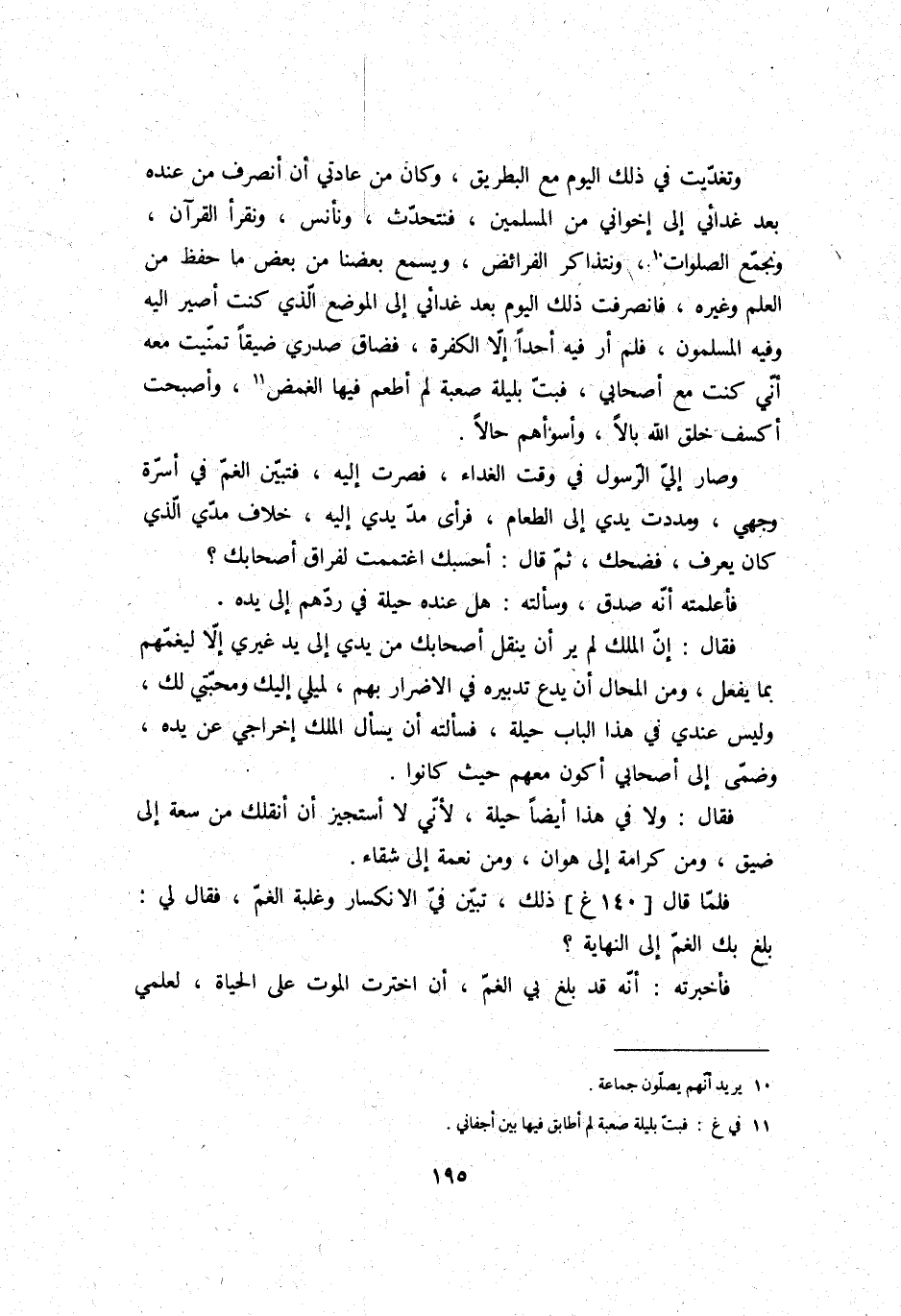 وتغديت فِي ذَلِك الْيَوْم مَعَ البطريق، وَكَانَ من عادتي أَن أنصرف من عِنْده بعد غدائي إِلَى إخْوَانِي من الْمُسلمين، فنتحدث، ونأنس، ونقرأ الْقُرْآن، ونجمع الصَّلَوَات، ونتذاكر الْفَرَائِض، وَيسمع بَعْضنَا من بعض مَا حفظ من الْعلم وَغَيره، فَانْصَرَفت ذَلِك الْيَوْم بعد غدائي إِلَى الْموضع الَّذِي كنت أصير إِلَيْهِ، وَفِيه السلمون، فَلم أر فِيهِ أحدا إِلَّا الْكَفَرَة، فَضَاقَ صَدْرِي ضيقا تمنيت مَعَه أَنِّي كنت مَعَ أَصْحَابِي، فَبت بليلة صعبة لم أطْعم فِيهَا الغمض، وأصبحت أكسف خلق الله بَالا، وأسوأهم حَالا.