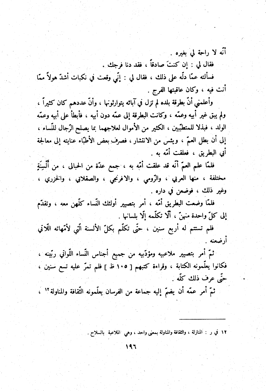 وأعلمني أَن بطرقة بَلَده لم تزل فِي آبَائِهِ يتوارثونها، وَأَن عَددهمْ كَانَ كثيرا، وَلم يبْق غير أَبِيه وَعَمه، وَكَانَت البطرقة إِلَى عَمه دون أَبِيه، فَأَبْطَأَ على أَبِيه وَعَمه الْوَلَد، فبذلا للمتطببين الْكثير من الْأَمْوَال لعلاجهما بِمَا يصلح الرِّجَال للنِّسَاء، إِلَى أَن بَطل الْعم، ويئس من الانتشار، فصرف بعض الْأَطِبَّاء عنايته إِلَى معالجة أبي البطريق، فعلقت أمه بِهِ.