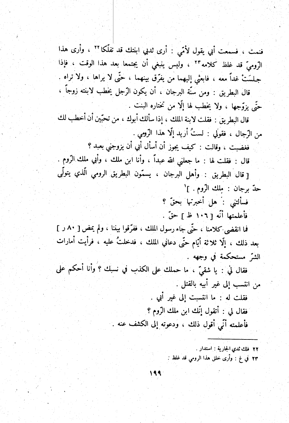 فَنمت، فَسمِعت أبي يَقُول لأمي: أرى ثديي ابْنَتك قد تفلكا، وَأرى هَذَا الرُّومِي قد غلظ كَلَامه، وَلَيْسَ يَنْبَغِي أَن يجتمعا بعد هَذَا الْوَقْت، فَإِذا جَلَست غَدا مَعَه، فابعثي إِلَيْهِمَا من يفرق بَينهمَا، حَتَّى لَا يَرَاهَا، وَلَا ترَاهُ.