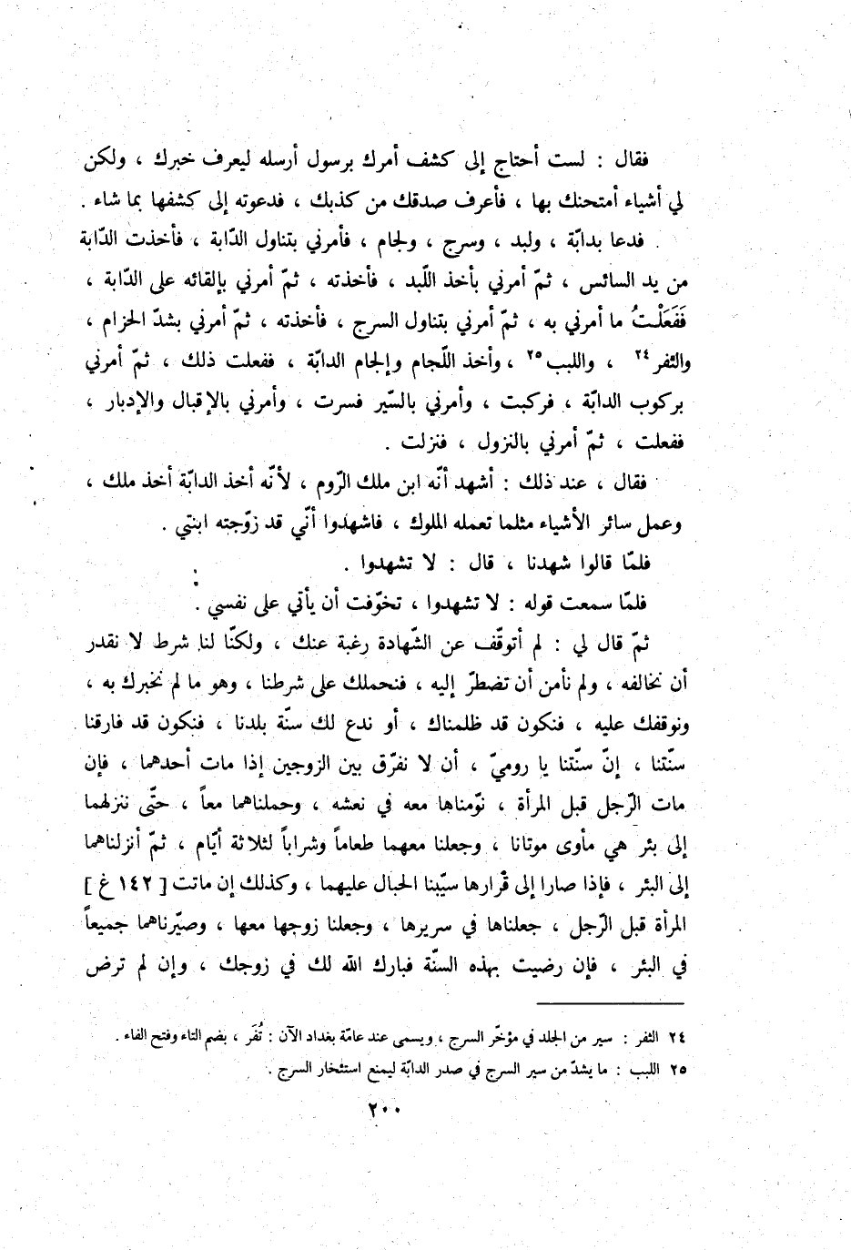 ثمَّ قَالَ لي: لم أتوقف عَن الشَّهَادَة رَغْبَة عَنْك، وَلَكنَّا لنا شَرط لَا نقدر أَن نخالفه، وَلم نَأْمَن أَن تضطر إِلَيْهِ، فنحملك على شرطنا، وَهُوَ مَا لم نخبرك بِهِ، ونوقفك عَلَيْهِ، فنكون قد ظَلَمْنَاك، أَو نَدع لَك سنة بلدنا، فنكون قد فارقنا سنتنا، إِن سنتنا يَا رومي، أَن لَا نفرق بَين الزَّوْجَيْنِ إِذا مَاتَ أَحدهمَا، فَإِن مَاتَ الرجل قبل الْمَرْأَة، نومناها مَعَه فِي نعشه، وحملناهما مَعًا، حَتَّى ننزلهما إِلَى بِئْر هِيَ مأوى مَوتَانا، وَجَعَلنَا مَعَهُمَا طَعَاما وَشَرَابًا لثَلَاثَة أَيَّام، ثمَّ أنزلناهما على الْبِئْر، فَإِذا صَارا إِلَى قَرَارهَا سيبنا الحبال عَلَيْهِمَا، وَكَذَلِكَ إِن مَاتَت الْمَرْأَة قبل الرجل، جعلناها فِي سريرها، وَجَعَلنَا زَوجهَا مَعهَا، وصيرناهما جَمِيعًا فِي الْبِئْر، فَإِن رضيت بِهَذِهِ السّنة فَبَارك الله لَك فِي زَوجك، وَإِن لم ترض