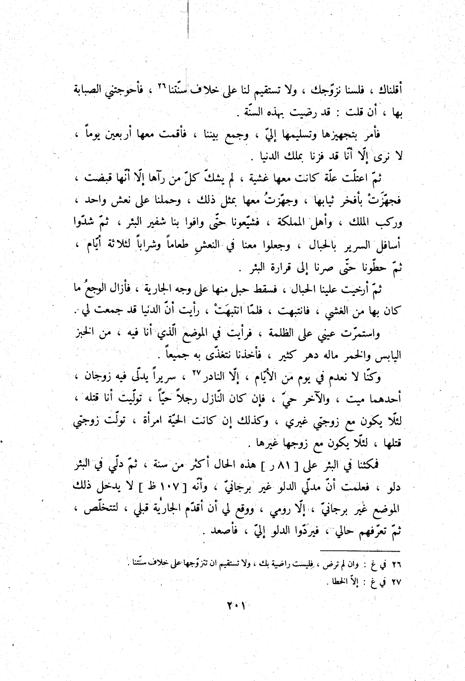 فَمَكثْنَا فِي الْبِئْر على هَذِه الْحَال أَكثر من سنة، ثمَّ دُلي فِي الْبِئْر دلو، فَعلمت أَن مدلي الدَّلْو غير برجاني، وَأَنه لَا يدْخل ذَلِك الْموضع غير برجاني، إِلَّا رومي، وَوَقع لي أَن أقدم الْجَارِيَة قبلي، لتتخلص، ثمَّ تعرفهم حَالي، فيردوا الدَّلْو إِلَيّ، فأصعد.