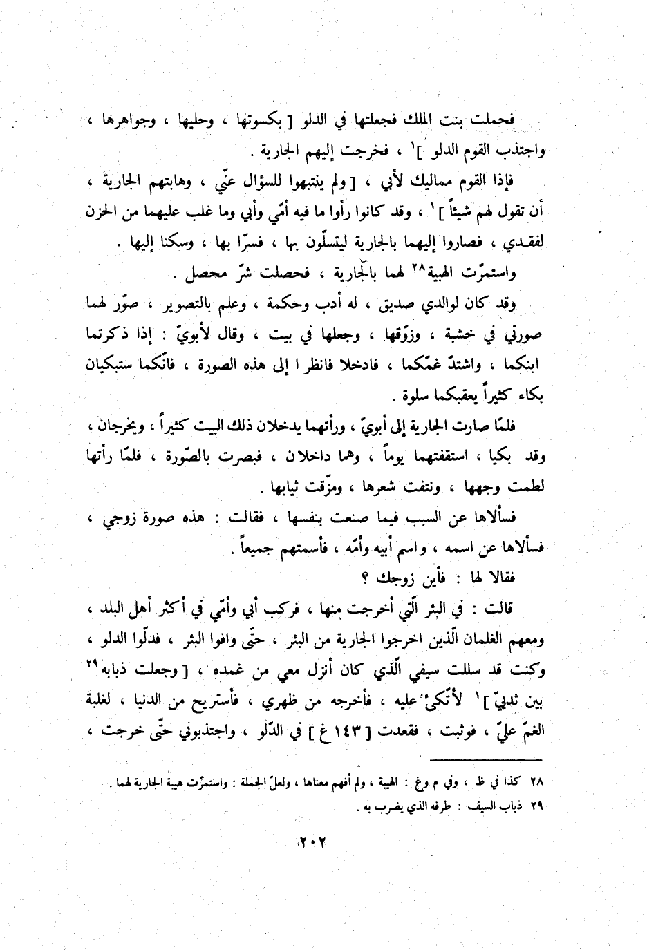 فَإِذا الْقَوْم مماليك لأبي، وَلم ينتبهوا للسؤال عني، وهابتهم الْجَارِيَة، أَن تَقول لَهُم شَيْئا، وَقد كَانُوا رَأَوْا مَا فِيهِ أُمِّي وَأبي وَمَا غلب عَلَيْهِمَا من الْحزن لفقدي، فصاروا إِلَيْهِمَا بالجارية ليتسلون بهَا، فسرا بهَا، وسكنا إِلَيْهَا.