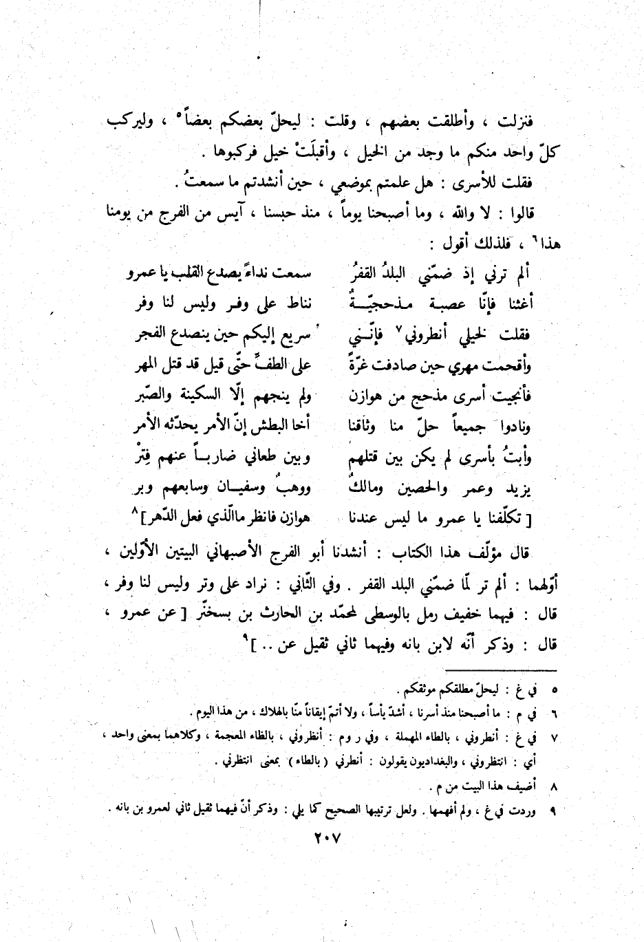 قَالَ مؤلف هَذَا الْكتاب: أنشدنا أَبُو الْفرج الْأَصْبَهَانِيّ الْبَيْتَيْنِ الْأَوَّلين، أَولهمَا: ألم تَرَ لما ضمني الْبَلَد القفر، وَفِي الثَّانِي: نراد على وتر وَلَيْسَ لنا وفر، قَالَ: فيهمَا خَفِيف رمل بالوسطى لمُحَمد بن الْحَارِث بن بسخنر، عَن عَمْرو، قَالَ: وَذكر أَنه لِابْنِ بانه وَفِيهِمَا ثَانِي ثقيل عَن. . .