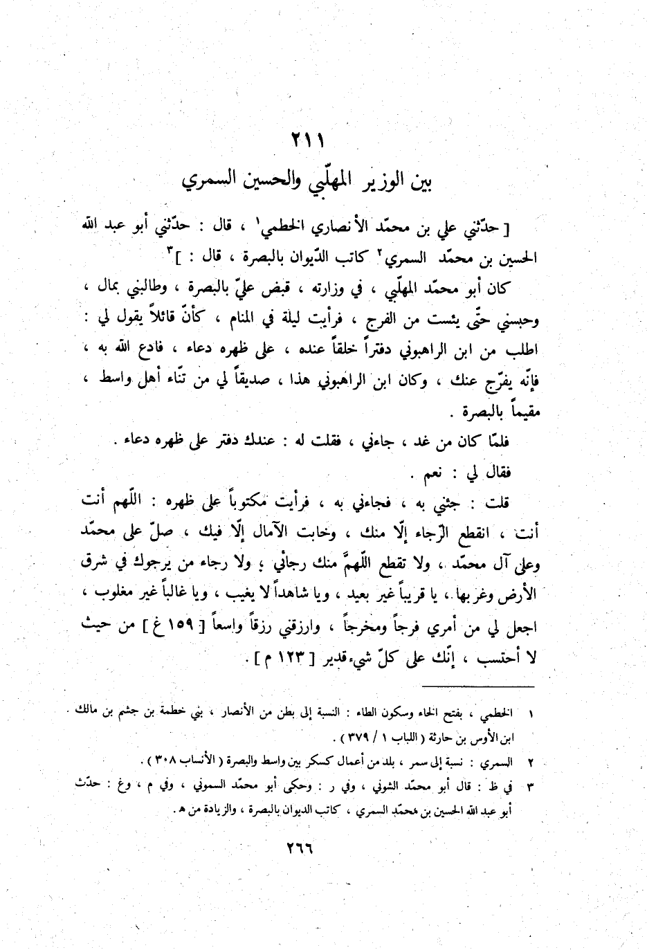 حَدثنِي عَليّ بن مُحَمَّد الْأنْصَارِيّ الحطمي، قَالَ: حَدثنِي أَبُو عبد الله الْحُسَيْن بن مُحَمَّد السمري كَاتب الدِّيوَان بِالْبَصْرَةِ، قَالَ: كَانَ أَبُو مُحَمَّد المهلبي، فِي وزارته قبض عَليّ بِالْبَصْرَةِ، وطالبني بِمَال وحبسني حَتَّى يئست من الْفرج، فَرَأَيْت لَيْلَة فِي الْمَنَام، كَأَن قَائِلا يَقُول لي: اطلب من ابْن الراهبوني دفترا خلقا عِنْده، على ظَهره دُعَاء، فَادع الله بِهِ، فَإِنَّهُ يفرج عَنْك، وَكَانَ ابْن الراهبوني هَذَا، صديقا لي من تناء أهل وَاسِط مُقيما بِالْبَصْرَةِ.