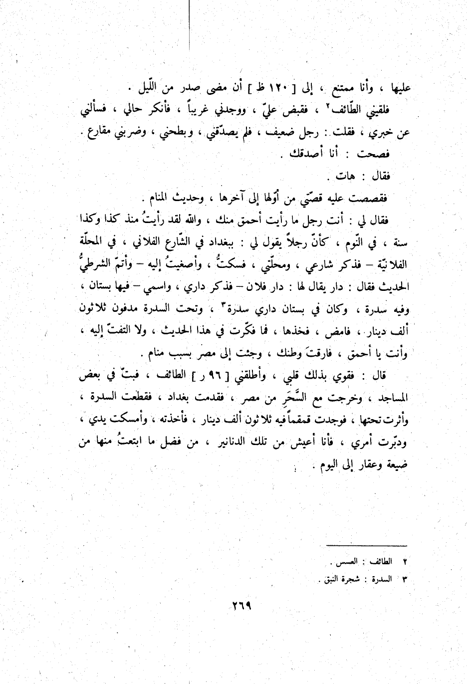 فَقَالَ لي: أَنْت رجل مَا رَأَيْت أَحمَق مِنْك، وَالله لقد رَأَيْت مُنْذُ كَذَا وَكَذَا سنة، فِي النّوم، كَأَن رجلا يَقُول لي: بِبَغْدَاد فِي الشَّارِع الْفُلَانِيّ، فِي الْمحلة الْفُلَانِيَّة، فَذكر شارعي، ومحلتي، فَسكت، وأصغيت إِلَيْهِ، وَأتم الشرطي الحَدِيث، فَقَالَ: دَار يُقَال لَهَا: دَار فلَان، فَذكر دَاري، واسمي، فِيهَا بُسْتَان، وَفِيه سِدْرَة، وَكَانَ فِي بُسْتَان دَاري سِدْرَة، وَتَحْت السِّدْرَة مدفون ثَلَاثُونَ ألف دِينَار، فَامْضِ، فَخذهَا، فَمَا فَكرت فِي هَذَا الحَدِيث، وَلَا الْتفت إِلَيْهِ، وَأَنت يَا أَحمَق، فَارَقت وطنك، وَجئْت إِلَى مصر بِسَبَب مَنَام.