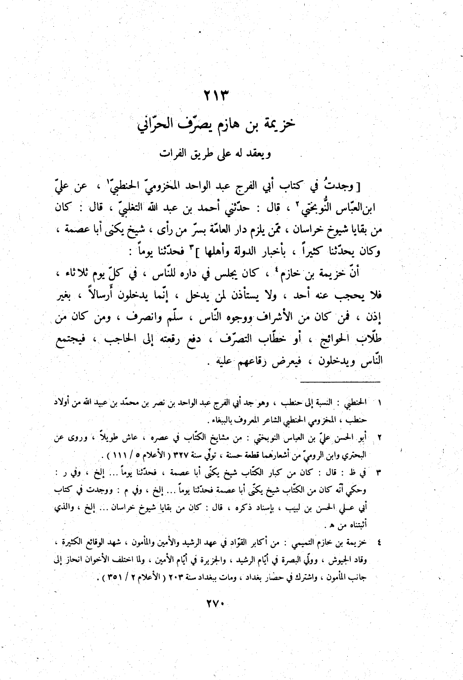 وجدت فِي كتاب أبي الْفرج عبد الْوَاحِد المَخْزُومِي الحنطبي، عَن عَليّ بن الْعَبَّاس النوبختي، قَالَ: حَدثنِي أَحْمد بن عبد الله التغلبي، قَالَ: كَانَ من بقايا شُيُوخ خُرَاسَان، مِمَّن يلْزم دَار الْعَامَّة بسر من رأى، شيخ يكنى أَبَا عصمَة، وَكَانَ يحدثنا كثيرا، بأخبار الدولة وَأَهْلهَا، فحدثنا يَوْمًا: أَن خُزَيْمَة بن خازم كَانَ يجلس فِي دَاره للنَّاس، فِي كل يَوْم ثلاثاء، فَلَا يحجب عَنهُ أحد، وَلَا يسْتَأْذن لمن يدْخل، إِنَّمَا يدْخلُونَ أَرْسَالًا، بِغَيْر إِذن، فَمن كَانَ من الْأَشْرَاف ووجوه النَّاس، سلم وَانْصَرف، وَمن كَانَ من طلاب الْحَوَائِج، أَو خطاب التَّصَرُّف، دفع رقعته إِلَى الْحَاجِب، فيجتمع النَّاس ويدخلون، فَيعرض رقاعهم عَلَيْهِ.