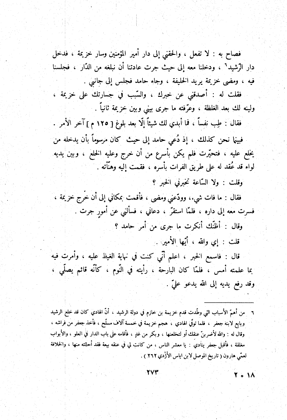 فصاح بِهِ: لَا تفعل، والحقني إِلَى دَار أَمِير الْمُؤمنِينَ وَسَار خُزَيْمَة، فَدخل دَار الرشيد، ودخلنا مَعَه إِلَى حَيْثُ جرت عادتنا أَن نبلغه من الدَّار، فَجَلَسْنَا فِيهِ، وَمضى خُزَيْمَة يُرِيد الْخَلِيفَة، وَجَاء حَامِد فَجَلَسَ إِلَى جَانِبي.