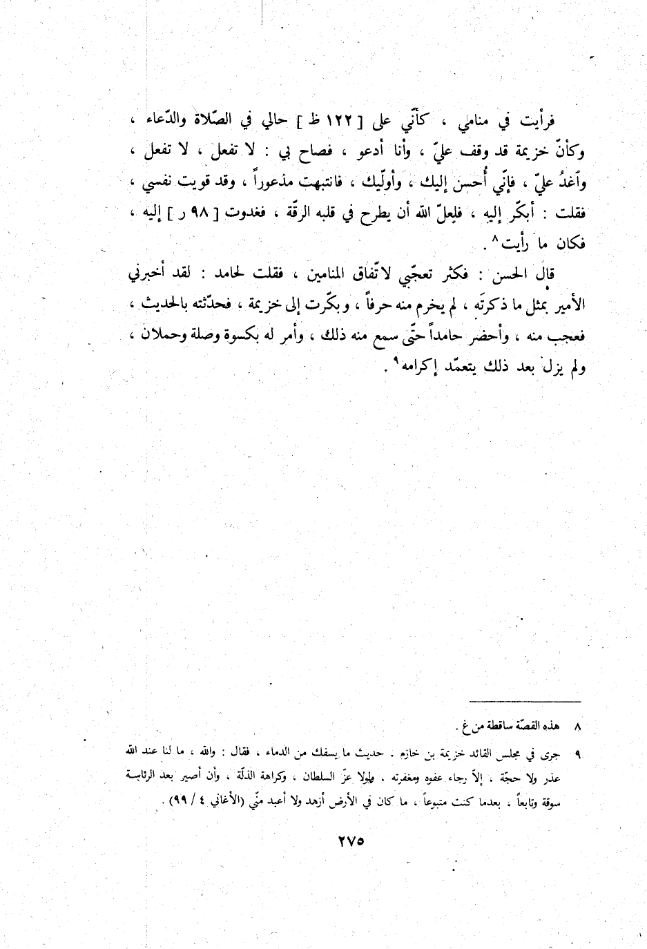 فَرَأَيْت فِي مَنَامِي كَأَنِّي على حَالي فِي الصَّلَاة وَالدُّعَاء، وَكَأن خُزَيْمَة قد وقف عَليّ، وَأَنا أَدْعُو، فصاح بِي: لَا تفعل، لَا تفعل، واغد عَليّ، فَإِنِّي أحسن إِلَيْك، وأوليك، فانتبهت مذعورا، وَقد قويت نَفسِي، فَقلت: أبكر إِلَيْهِ، فَلَعَلَّ الله أَن يطْرَح فِي قلبه الرقة، فَغَدَوْت إِلَيْهِ، فَكَانَ مَا رَأَيْت.