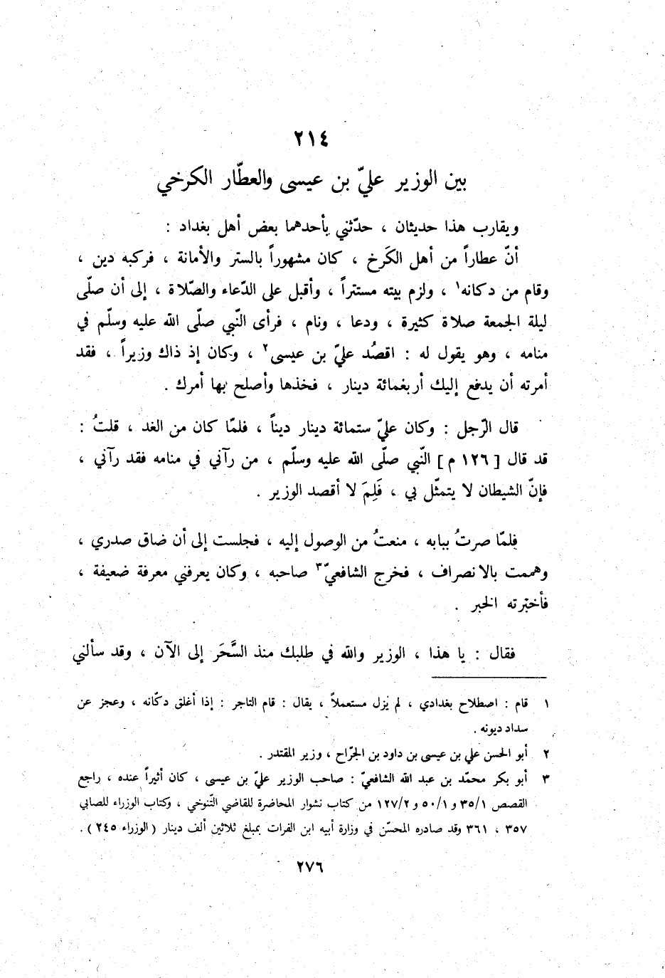 وَيُقَارب هَذَا حديثان، حَدثنِي بِأَحَدِهِمَا بعض أهل بَغْدَاد: أَن عطارا من أهل الكرخ، كَانَ مَشْهُورا بالستر وَالْأَمَانَة، فَرَكبهُ دين، وَقَامَ من دكانه، وَلزِمَ بَيته مستترا، وَأَقْبل على الدُّعَاء وَالصَّلَاة، إِلَى أَن صلى لَيْلَة الْجُمُعَة صَلَاة كَثِيرَة، ودعا، ونام، فَرَأى النَّبِي صلى الله عَلَيْهِ وَسلم فِي مَنَامه، وَهُوَ يَقُول لَهُ: اقصد عَليّ بن عِيسَى، وَكَانَ إِذْ ذَاك وزيرا، فقد أَمرته أَن يدْفع إِلَيْك أَربع مائَة دِينَار، فَخذهَا وَأصْلح بهَا أَمرك.