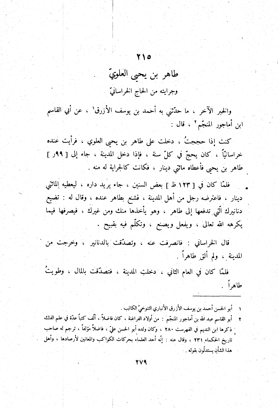 وَالْخَبَر الآخر، مَا حَدثنِي بِهِ أَحْمد بن يُوسُف الْأَزْرَق، عَن أبي الْقَاسِم بن أماجور المنجم، قَالَ: كنت إِذا حججْت، دخلت على طَاهِر بن يحيى الْعلوِي، فَرَأَيْت عِنْده خراسانيا، كَانَ يحجّ فِي كل سنة، فَإِذا دخل الْمَدِينَة، جَاءَ إِلَى طَاهِر بن يحيى فَأعْطَاهُ مِائَتي دِينَار، فَكَانَت كالجراية لَهُ مِنْهُ.