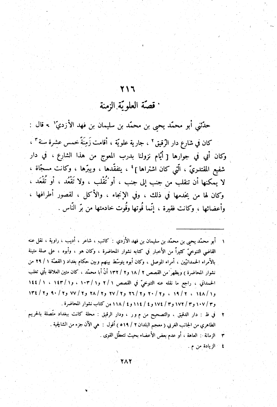 حَدثنِي أَبُو مُحَمَّد يحيى بن مُحَمَّد بن سُلَيْمَان بن فَهد الْأَزْدِيّ، قَالَ: كَانَ فِي شَارِع دَار الرَّقِيق، جَارِيَة علوِيَّة، أَقَامَت زمنة خمس عشرَة سنة، وَكَانَ أبي فِي جوارها، أَيَّام نزولنا بدرب المعوج من هَذ الشَّارِع، فِي دَار شَفِيع المقتدري، الَّتِي كَانَ اشْتَرَاهَا، يتفقدها، ويبرها، وَكَانَت مسجاة، لَا يُمكنهَا أَن تنْقَلب من جنب إِلَى جنب، أَو تقلب، وَلَا تقعد، أَو تقعد، وَكَانَ لَهَا من يخدمها فِي ذَلِك، وَفِي الإنجاء، وَالْأكل، لقُصُور أطرافها، وأعضائها، وَكَانَت فقيرة، إِنَّمَا قوتها وقوت خادمتها من بر النَّاس.
