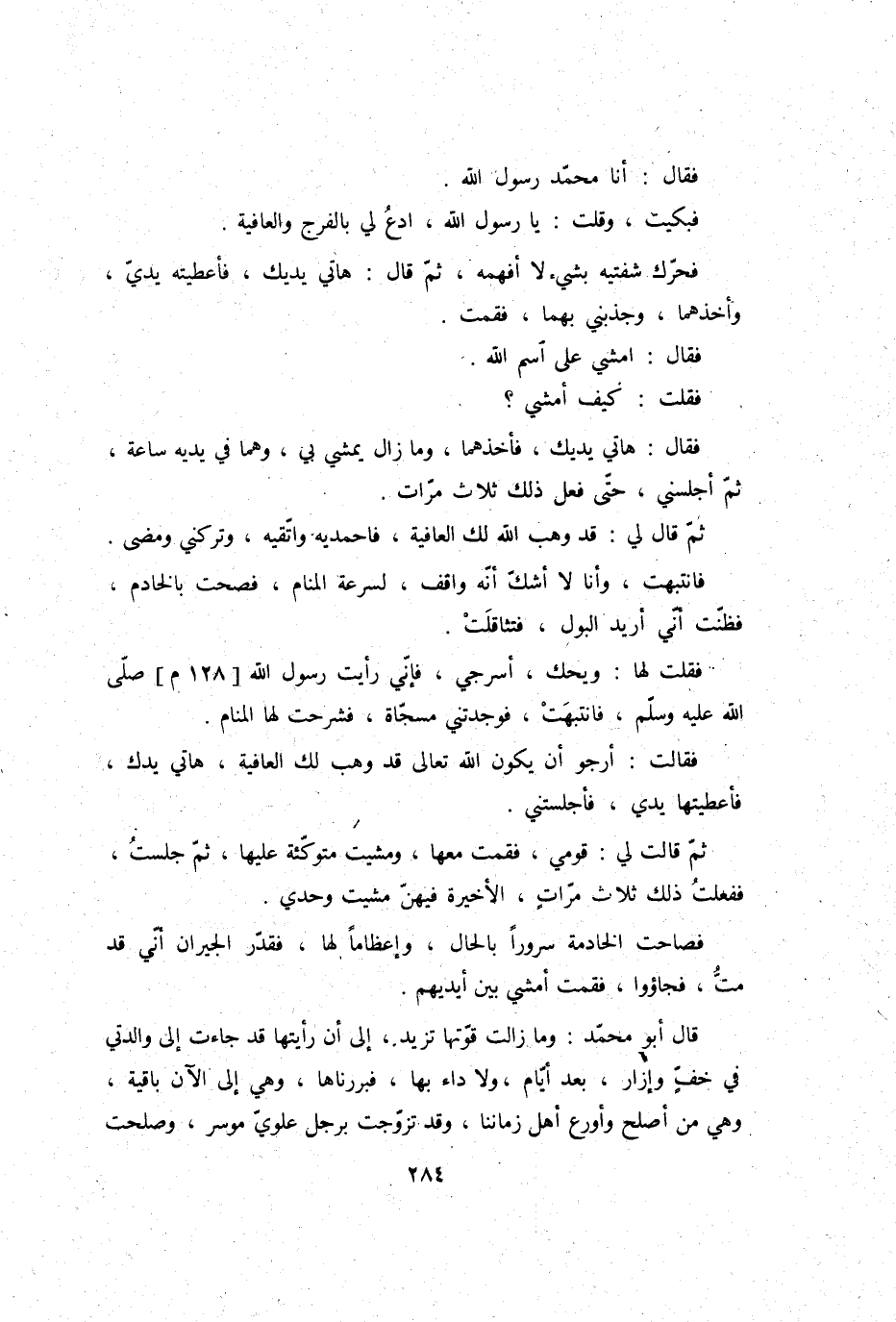قَالَ أَبُو مُحَمَّد: وَمَا زَالَت قوتها تزيد، إِلَى أَن رَأَيْتهَا قد جَاءَت إِلَى والدتي فِي خف وَإِزَار، بعد أَيَّام، وَلَا دَاء بهَا، فبررناها، وَهِي إِلَى الْآن بَاقِيَة، وَهِي من أصلح وَأَوْرَع أهل زَمَاننَا، وَقد تزوجت بِرَجُل علوي مُوسر، وصلحت