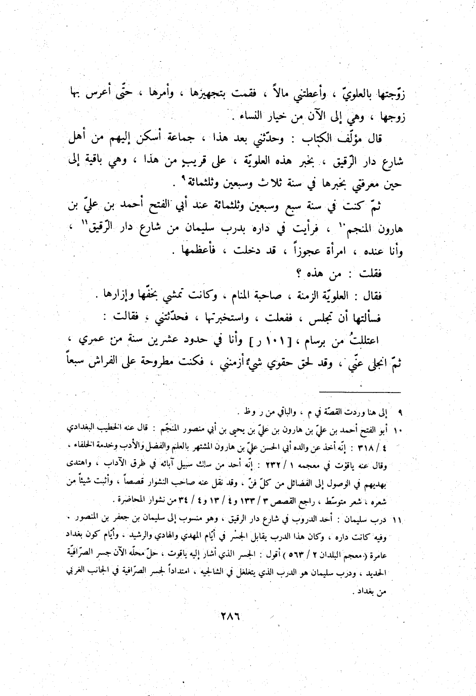 قَالَ مؤلف الْكتاب: وحَدثني بعد هَذَا جمَاعَة أسكن إِلَيْهِم من أهل شَارِع دَار الرَّقِيق، بِخَبَر هَذِه العلوية، على قريب من هَذَا، وَهِي بَاقِيَة إِلَى حِين معرفتي بخبرها فِي سنة ثَلَاث وَسبعين وَثَلَاث مائَة.