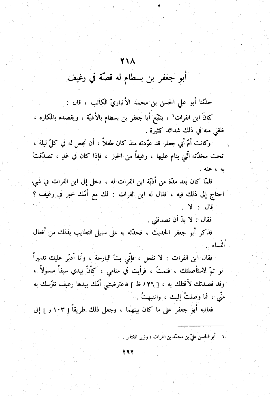 حَدثنَا أَبُو عَليّ الْحسن بن مُحَمَّد الْأَنْبَارِي الْكَاتِب، قَالَ: كَانَ ابْن الْفُرَات، يتبع أَبَا جَعْفَر بن بسطَام بالأذية، ويقصده بالمكاره، فلقي مِنْهُ فِي ذَلِك شَدَائِد كَثِيرَة.