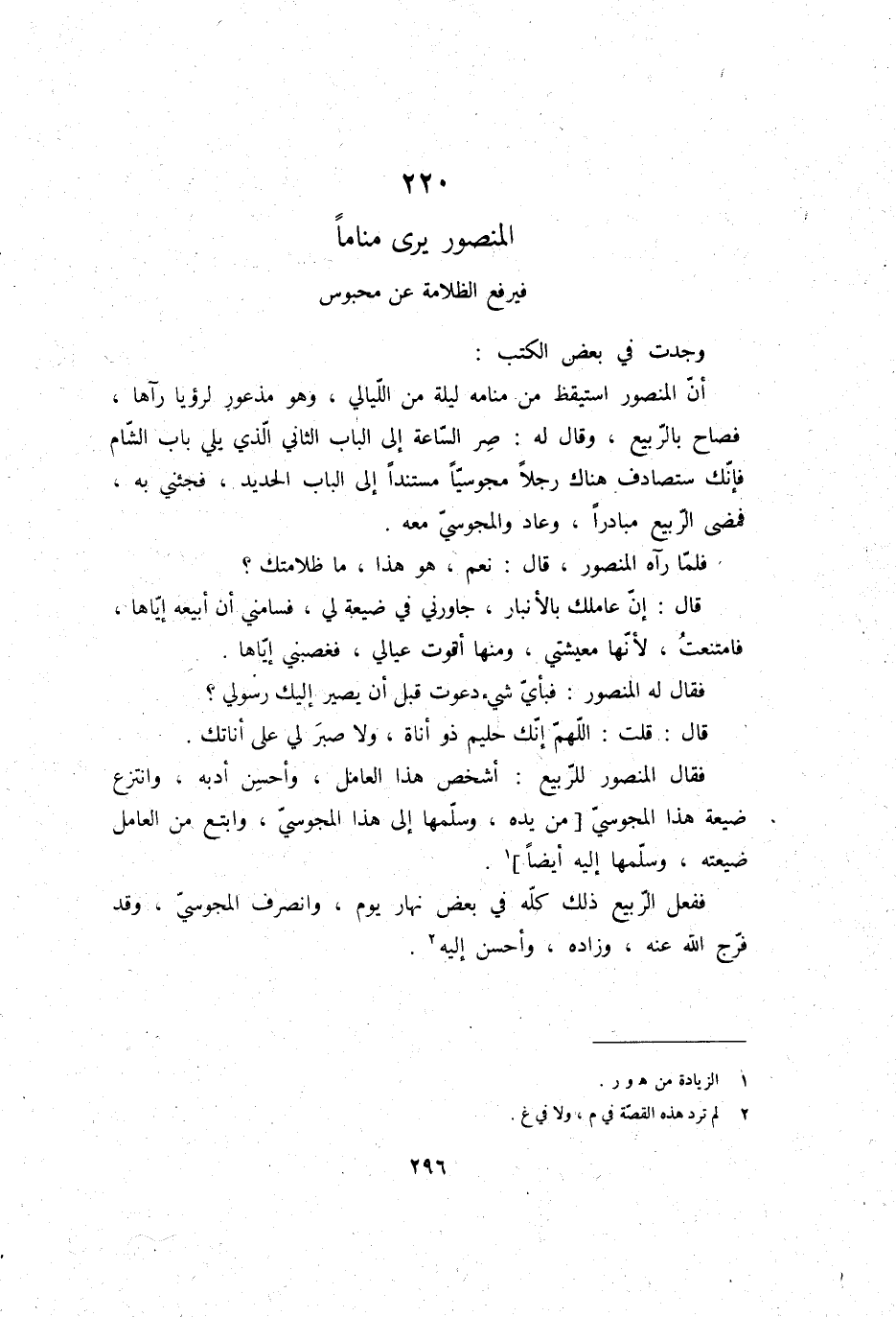 وجدت فِي بعض الْكتب: أَن الْمَنْصُور اسْتَيْقَظَ من مَنَامه لَيْلَة من اللَّيَالِي، وَهُوَ مذعور لرؤيا رَآهَا، فصاح بِالربيعِ، وَقَالَ لَهُ: صر السَّاعَة إِلَى الْبَاب الثَّانِي الَّذِي يَلِي بَاب الشَّام فَإنَّك ستصادف هُنَاكَ رجلا مجوسيا مُسْتَندا إِلَى الْبَاب الْحَدِيد، فجئني بِهِ، فَمضى الرّبيع مبادرا، وَعَاد والمجوسي مَعَه.