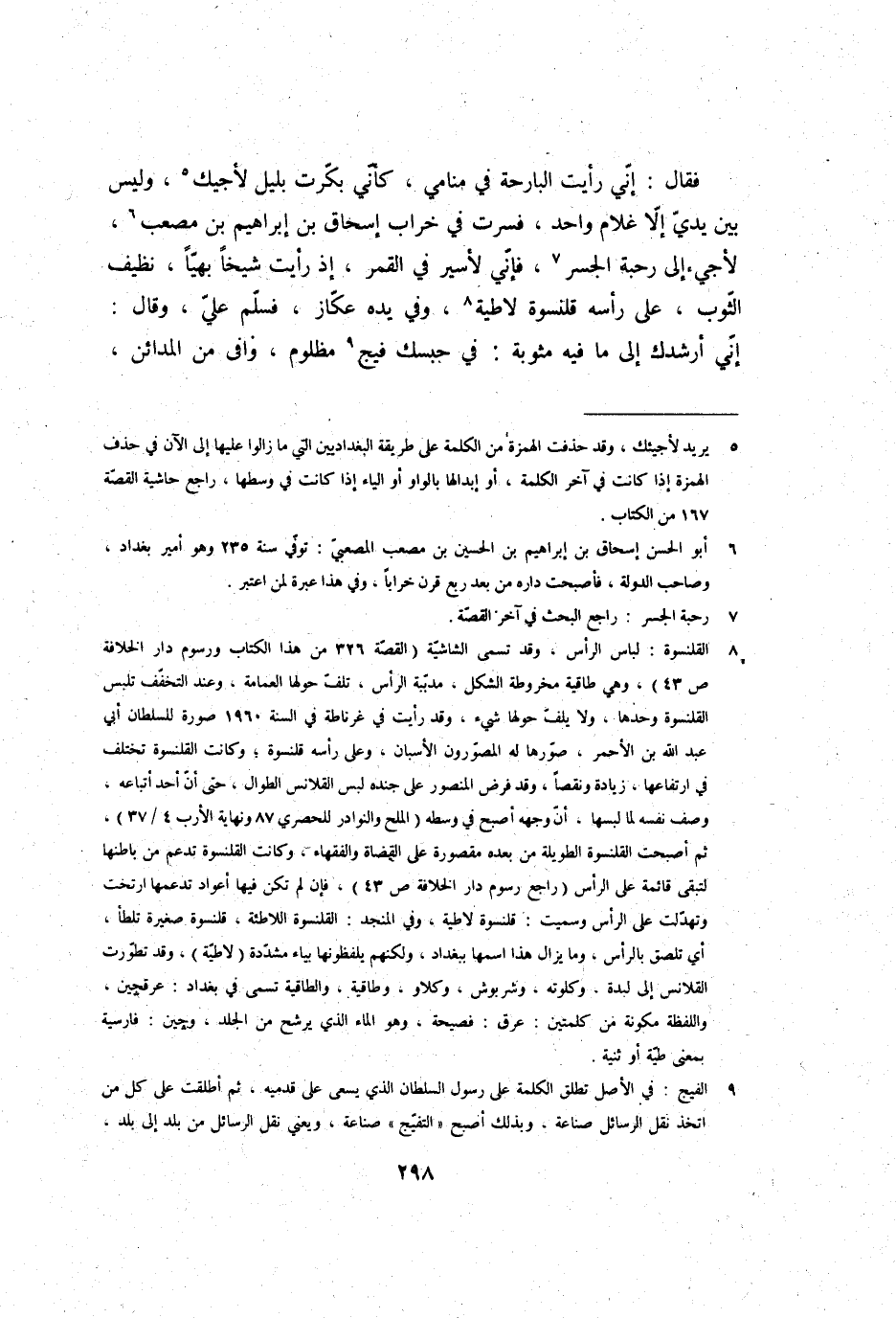 فَقَالَ: إِنِّي رَأَيْت البارحة فِي مَنَامِي، كَأَنِّي بكرت بلَيْل لأجيك، وَلَيْسَ بَين يَدي إِلَّا غُلَام وَاحِد، فسرت فِي خراب إِسْحَاق بن إِبْرَاهِيم بن مُصعب، لأجيء إِلَى رحبة الجسر، فَإِنِّي لأسير فِي الْقَمَر، إِذْ رَأَيْت شَيخا بهيا نظيف الثَّوْب، على رَأسه قلنسوة لاطية، وَفِي يَده عكاز، فَسلم عَليّ، وَقَالَ: إِنِّي أرشدك إِلَى مَا فِيهِ مثوبة: فِي حَبسك فيج مظلوم، وافى من الْمَدَائِن،
