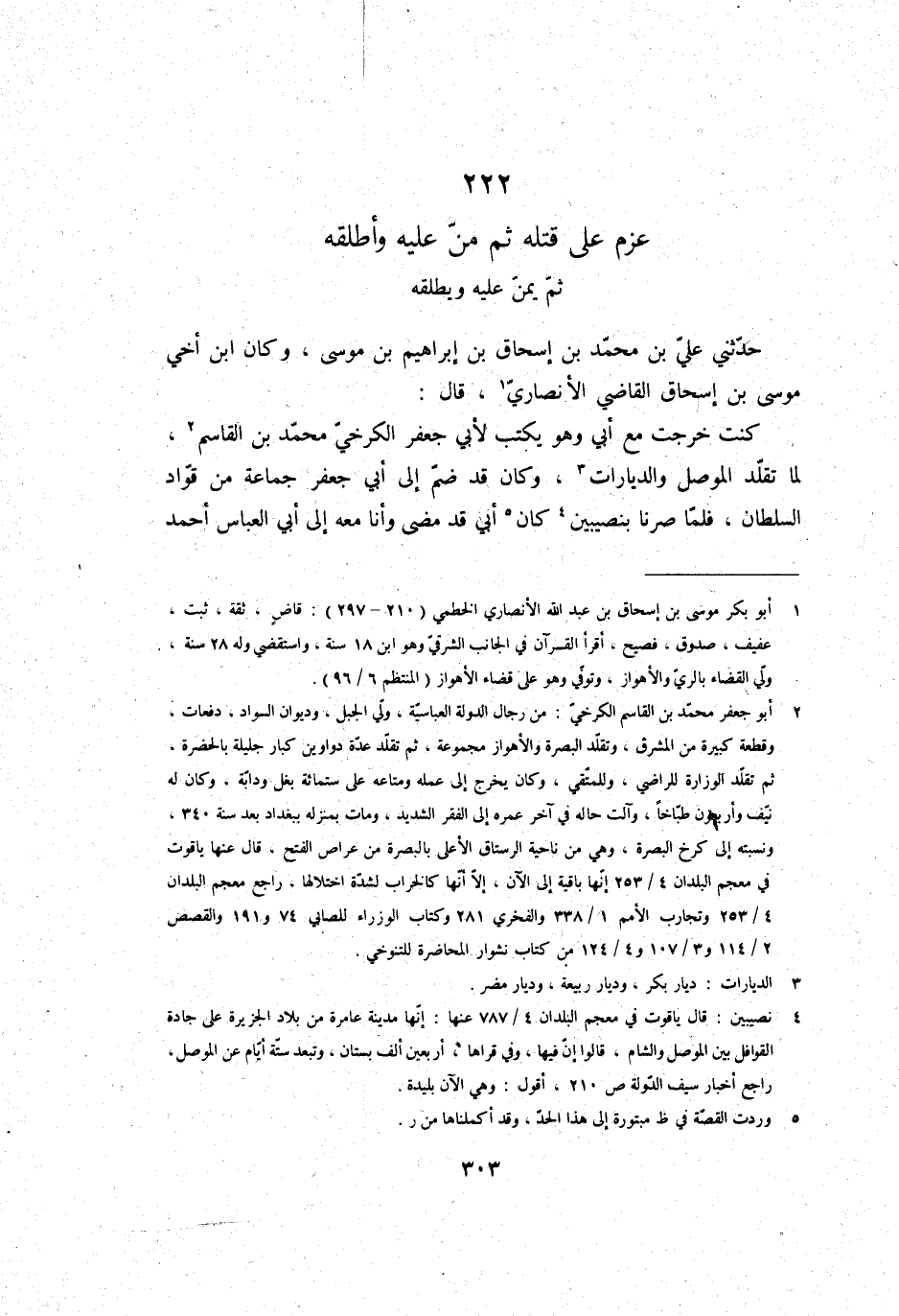 حَدثنِي عَليّ بن مُحَمَّد بن إِسْحَاق بن إِبْرَاهِيم بن مُوسَى، وَكَانَ ابْن أخي مُوسَى بن إِسْحَاق القَاضِي الْأنْصَارِيّ، قَالَ: كنت خرجت مَعَ أبي، وَهُوَ يكْتب لأبي جَعْفَر الْكَرْخِي مُحَمَّد بن الْقَاسِم، لما تقلد الْموصل والديارات، وَكَانَ قد ضم إِلَى أبي جَعْفَر جمَاعَة من قواد السُّلْطَان، فَلَمَّا صرنا بنصيبين كَانَ أبي قد مضى وَأَنا مَعَه إِلَى أبي الْعَبَّاس أَحْمد