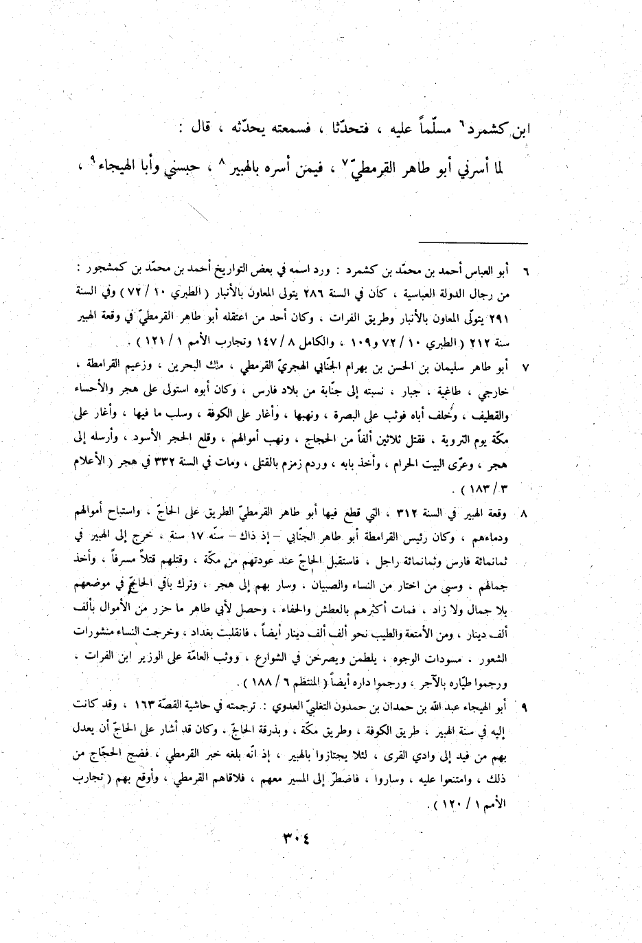 بن كشمرد مُسلما عَلَيْهِ، فتحدثا، فَسَمعته يحدثه، قَالَ: لما أسرني أَبُو طَاهِر القرمطي، فِيمَن أسره بالهبير، حَبَسَنِي وَأَبا الهيجاء،