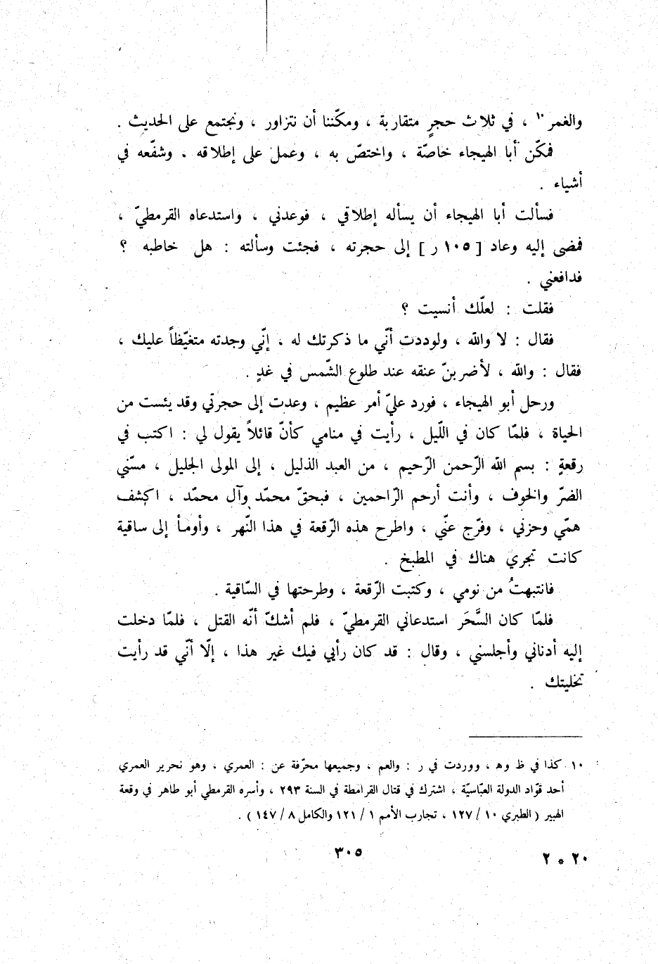 فَلَمَّا كَانَ السحر استدعاني القرمطي، فَلم أَشك أَنه الْقَتْل، فَلَمَّا دخلت إِلَيْهِ أدناني وأجلسني، وَقَالَ: قد كَانَ رَأْيِي فِيك غير هَذَا، إِلَّا أَنِّي قد رَأَيْت تخليتك.