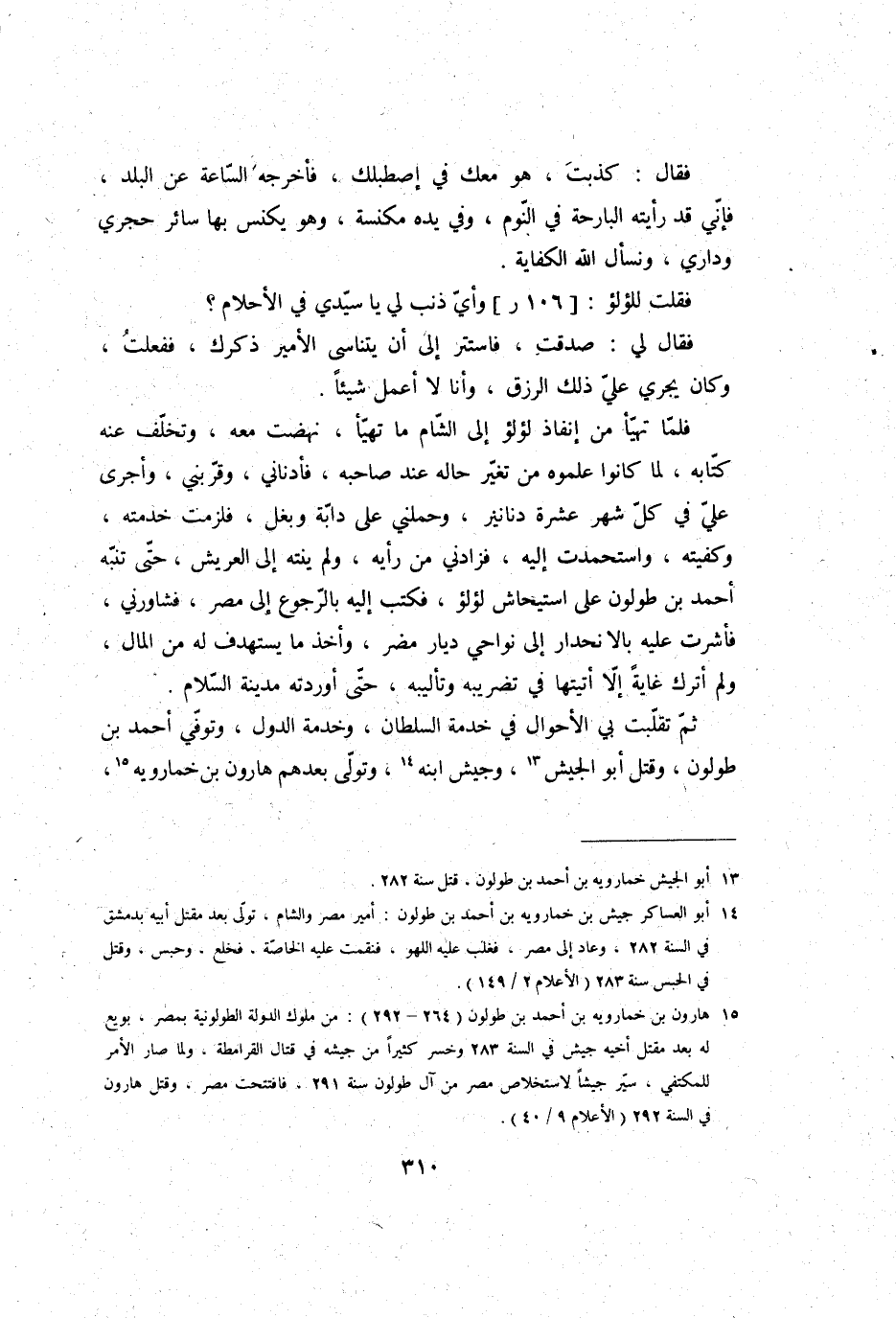 ثمَّ تقلبت بِي الْأَحْوَال فِي خدمَة السُّلْطَان، وخدمة الدول، وَتُوفِّي أَحْمد بن طولون، وَقتل أَبُو الْجَيْش، وجيش ابْنه، وَتَوَلَّى بعدهمْ هَارُون بن خمارويه،